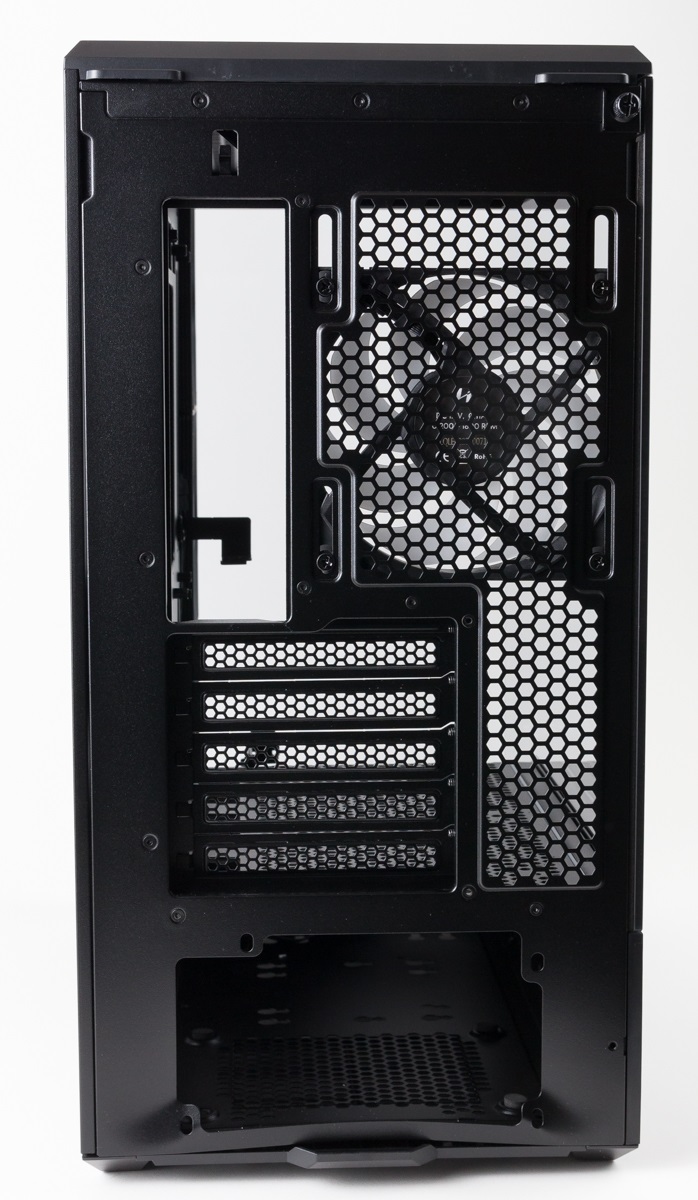 Die Rückseite zeigt die Löcher für Mainboardblende und Netzteil sowie die Slotblenden und einen vorinstallierten Lüfter. Gegenüber dem großen Bruder wurde vor allem bei der Anzahl der Slotblenden gespart.