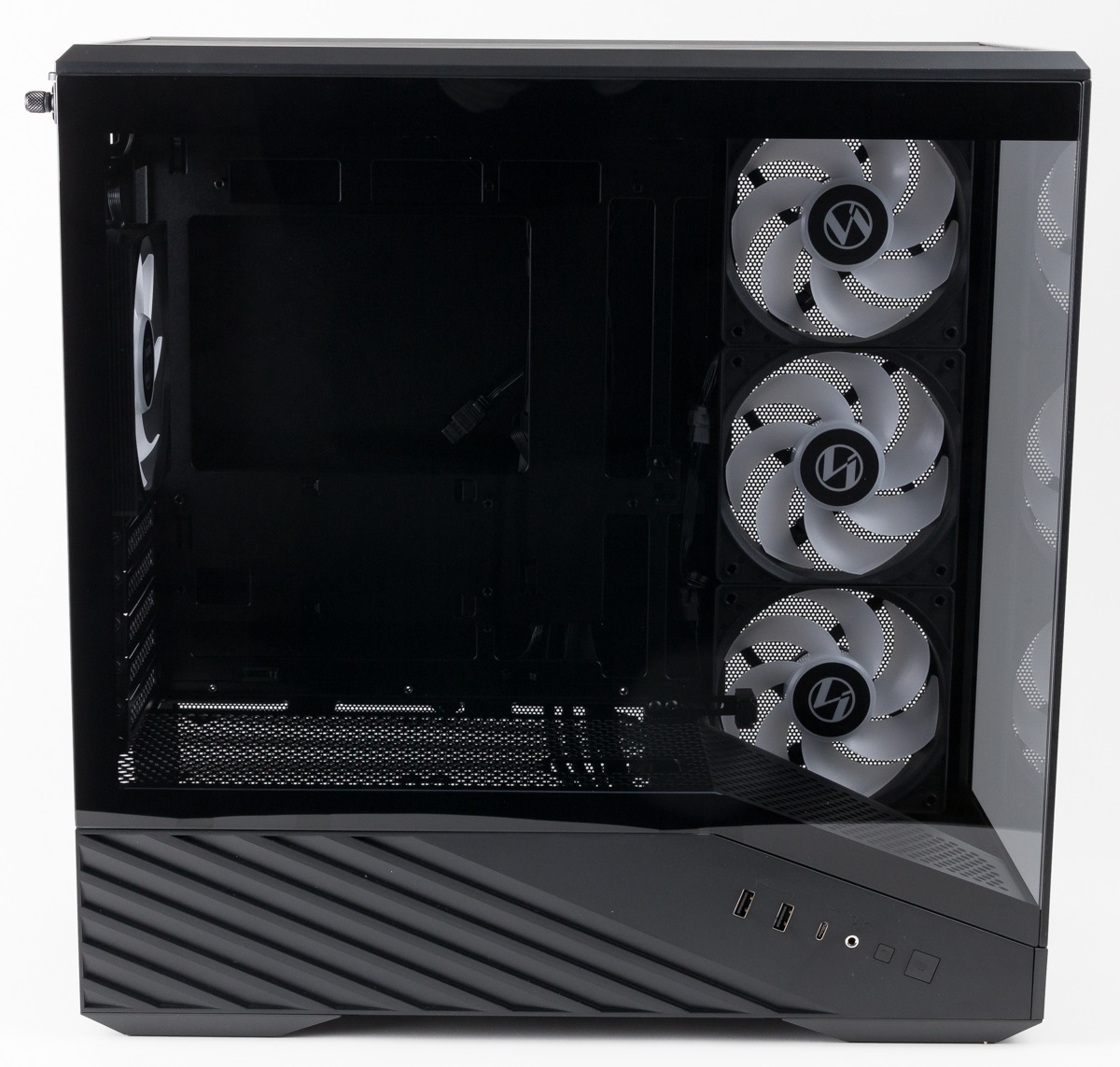 Das linke Seitenteil besteht zu einem großen Teil aus Echtglas, mit dem identischen Knick in Richtung Front. Unter dem Knick wurden Power- und Resetknopf sowie die Anschlüsse für Audio, zweimal USB 3.0 und einmal USB-C angebracht.