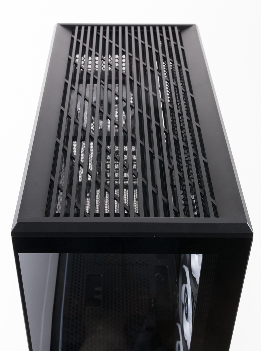 Das Top besteht durchgängig aus eher groben Lüftungsschlitzen, unter denen sich ein großer Staubfilter befindet.