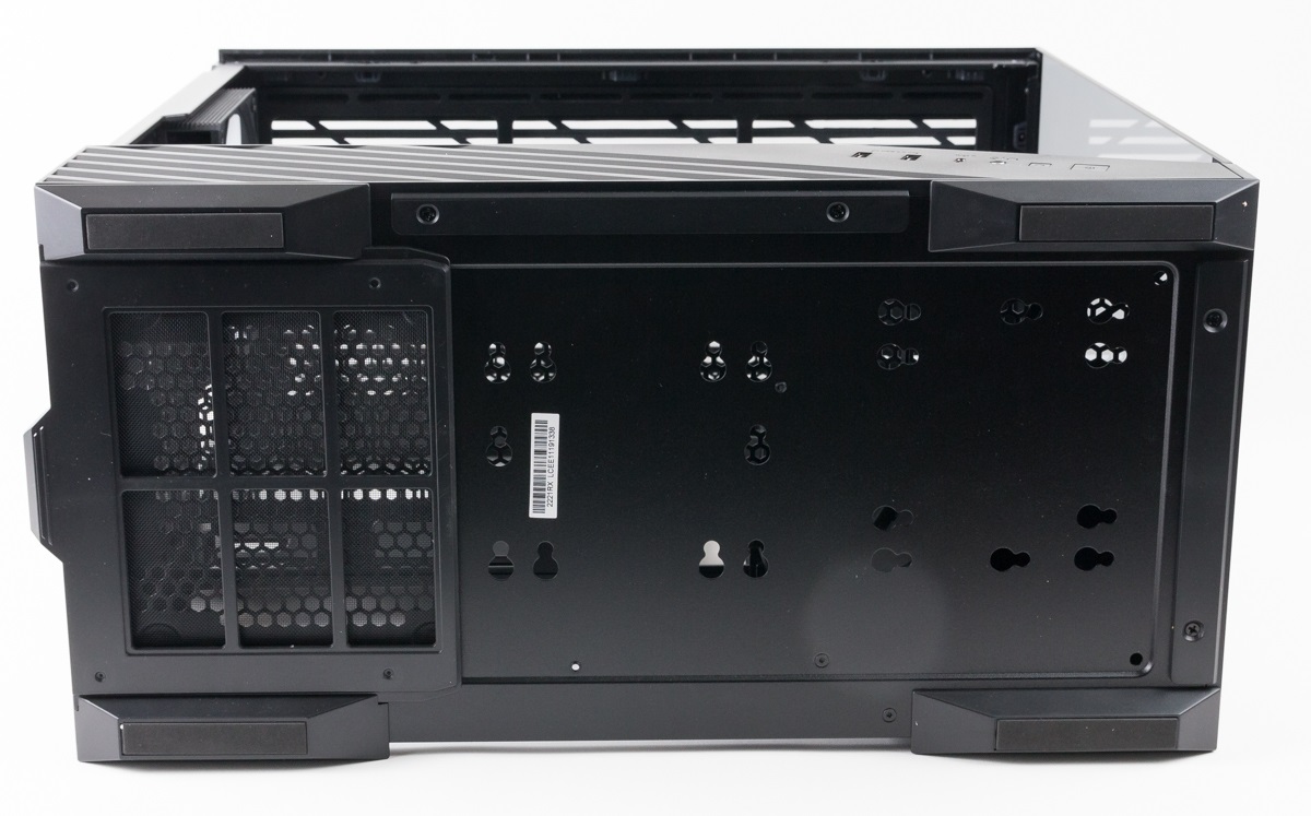 Die Unterseite besitzt einen kleinen Staubfilter und vier leicht gummierte Standfüße. Erkennbar sind zudem die Löcher, die für eine Festplattenbefestigtung vorgesehen sind und umfangreicher als beim großen Bruder ausfallen.