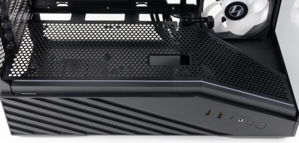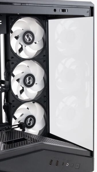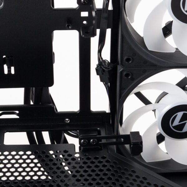 Im großen Bereich können Mainboard, Grafikkarte und Lüfter oder eine Wasserkühlung verbaut werden. Der untere Bereich soll das Netzteil, SSDs, Festplatten sowie den größten Teil der Kabel aufnehmen.