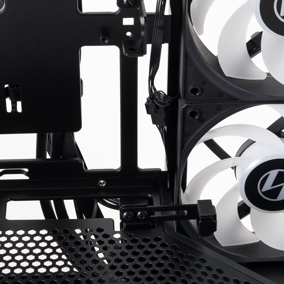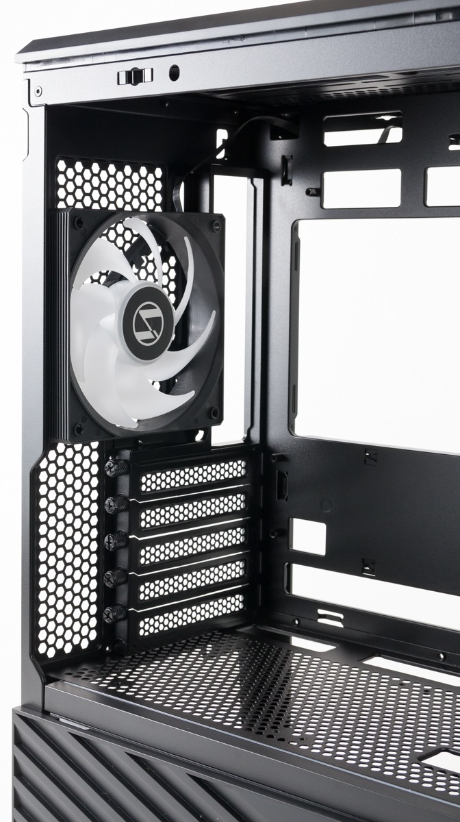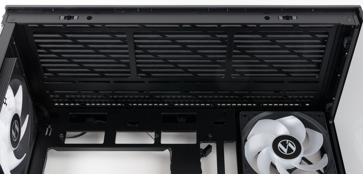 Auf dem Zwischenboden des Gehäuses können zwei 120-mm-Lüfter installiert werden. Unter dem Top ist Platz für drei weitere 120er oder alternativ zwei 140er Lüfter. Ein 360er Radiator könnte dort ebenfalls verbaut werden. Dies sind die gleichen Möglichkeiten wie beim großen Bruder.