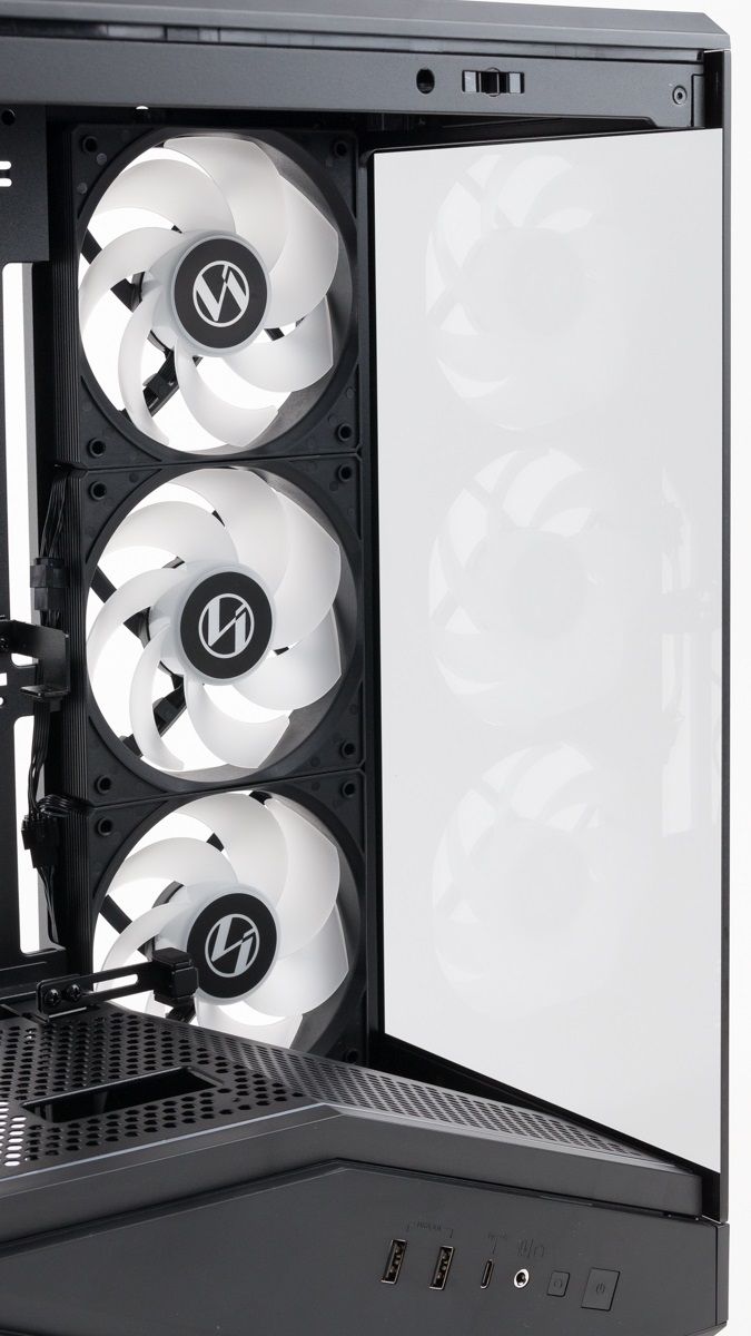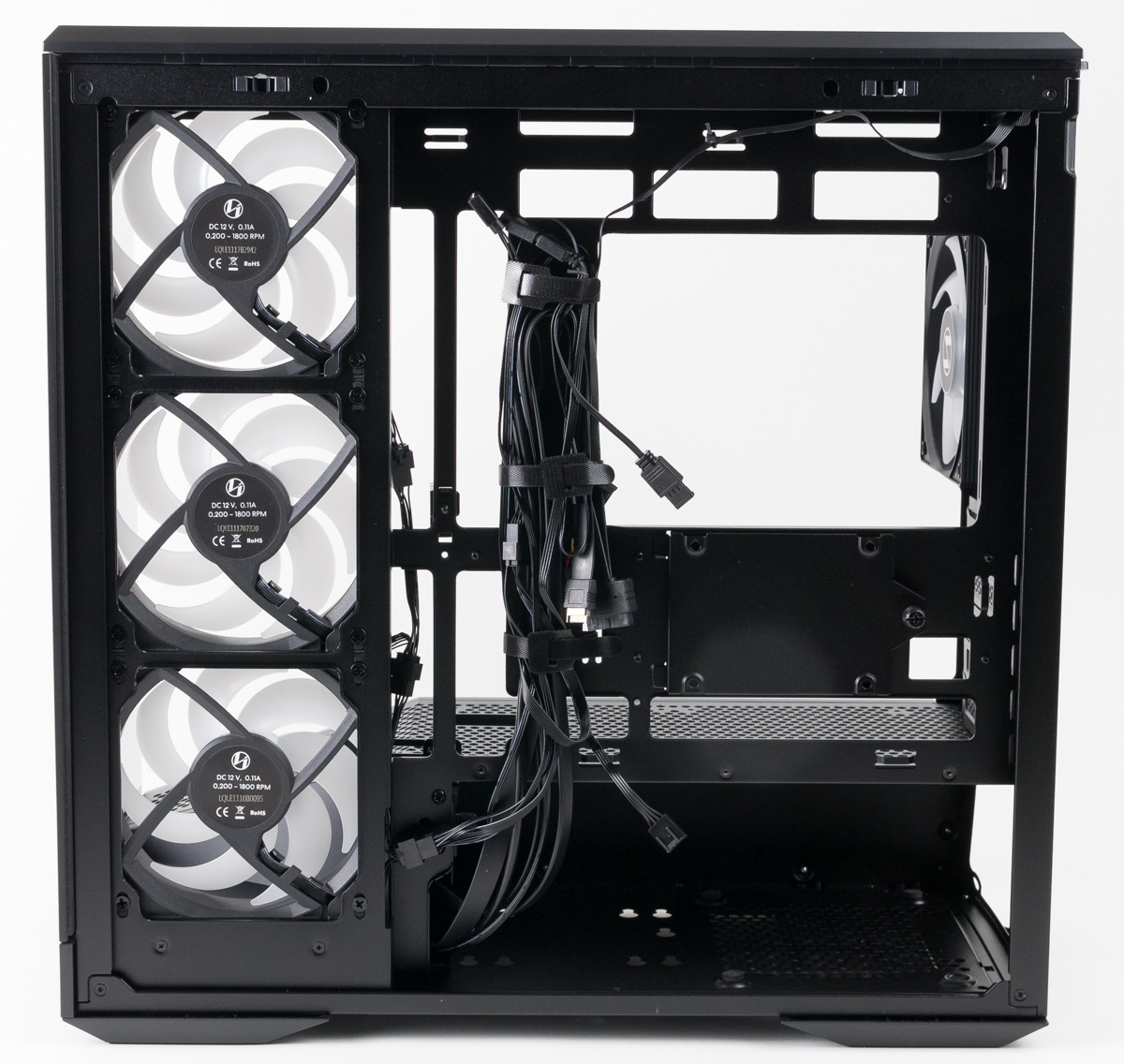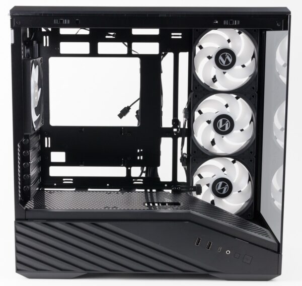 Hinter der Glasfront lassen sich keine Lüfter verbauen, daher sind seitlich davon drei beleuchtete 120er Lüfter installiert worden. Ein identisches Exemplar wurde auch im hinteren Teil verbaut.