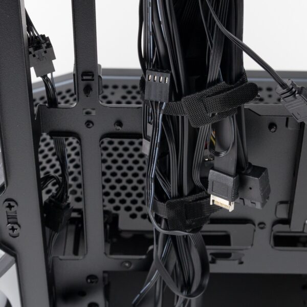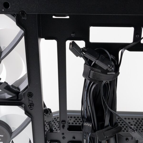Die vier verbauten beleuchteten Lüfter sowie der Leuchtstreifen sind bereits im Gehäuse vormontiert, sodass nur jeweils ein Kabel für die Beleuchtungs- und Lüftersteuerung am Mainboard befestigt werden muss.
