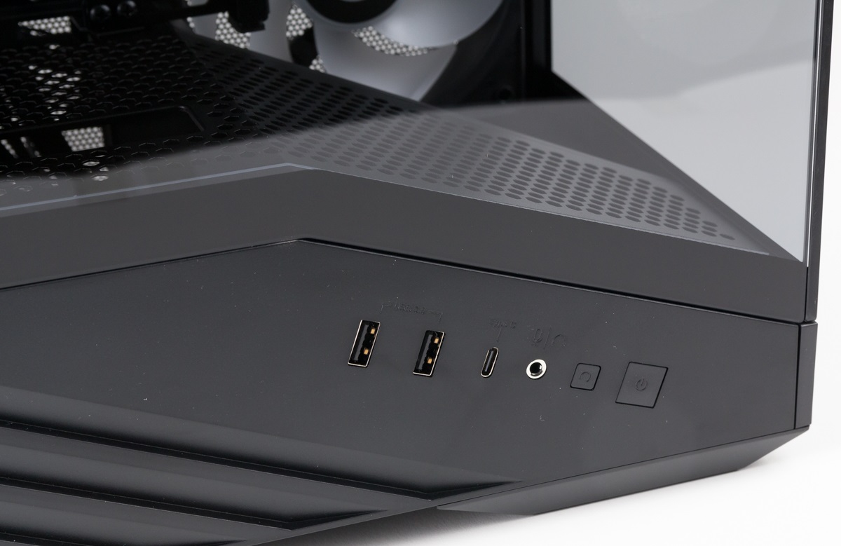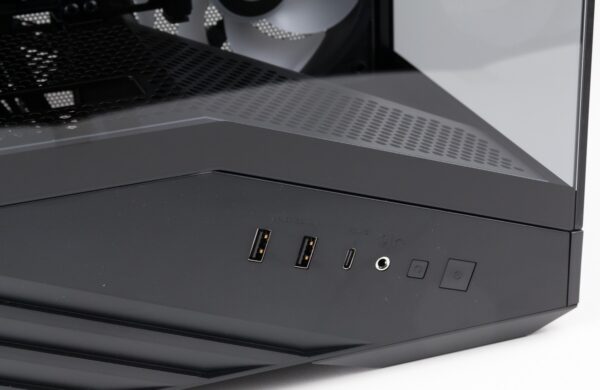 Der Power-Knopf und auch die Anschlüsse wurden weiterhin seitlich am unteren Teil des Gehäuses angebracht. Daher kann das Gehäuse nur sinnvoll genutzt werden, wenn es auf einem Schreibtisch betrieben wird. Bei einem Gehäuse mit zweiseitiger Verglasung dürfte dies aber ohnehin der primäre Platz sein.