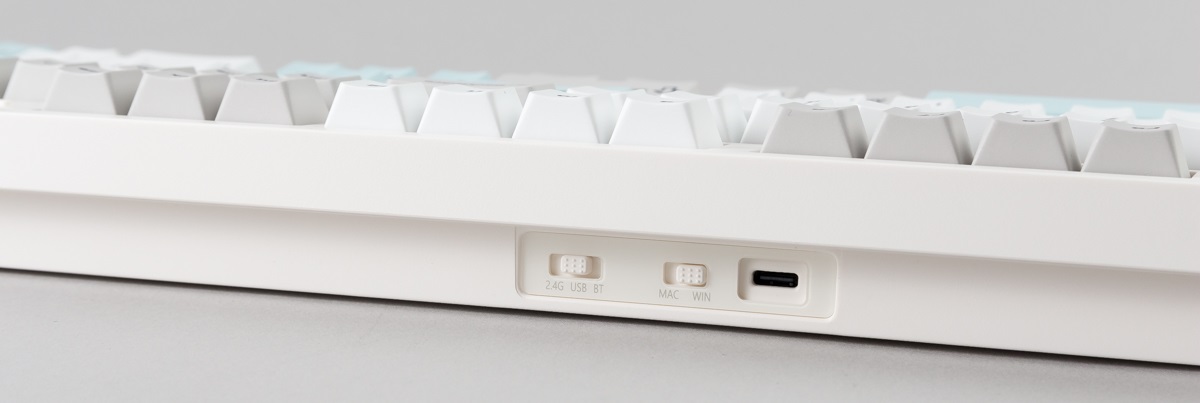 Relativ mittig gibt es auf der Rückseite eine USB-C-Buchse sowie zwei Schalter. Mit einem Schalter kann zwischen Windows und Mac gewechselt und mit dem anderen die Verbindungsart eingestellt werden. Gewählt werden kann zwischen einem Kabelbetrieb, einem Betrieb über den USB-Dongle oder einer Verbindung per Bluetooth.
