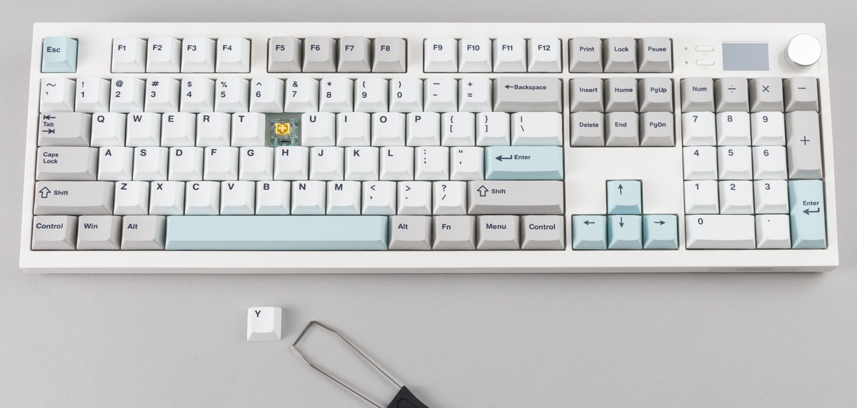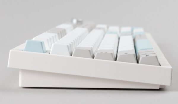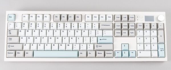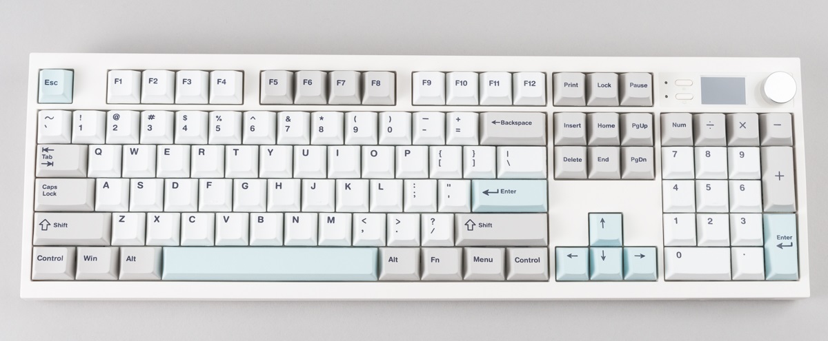 Die Tastatur wurde hauptsächlich mit gräulichen PBT-Keys ausgestattet und wirkt damit wie eine klassische Tastatur aus den Anfängen der PC-Ära. Andere Farbkombination werden aktuell nicht angeboten, ebenfalls nicht zur Verfügung steht ein deutsches Tastaturlayout.
