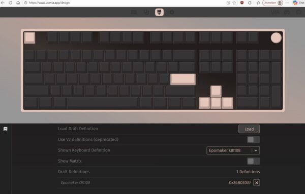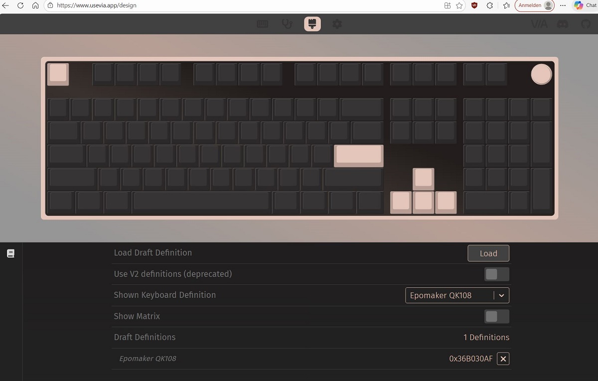 In der Anleitung der Epomaker QK108 und auch auf der Homepage des Herstellers wird auf die VIA-Software hingewiesen, die eine Vielzahl von Tastaturen unterstützt und nicht vom Hersteller selber zur Verfügung gestellt wird. Diese muss nicht installiert, sondern mit angeschlossener Tastatur eine Website geöffnet und die Tastatur dort zugewiesen werden.