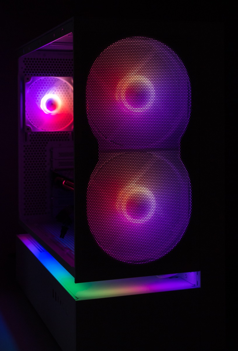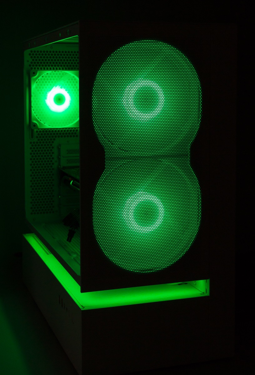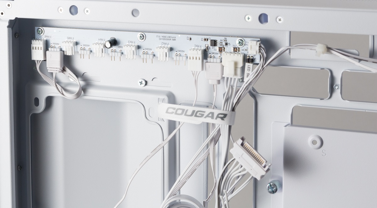 Die drei verbauten beleuchteten Lüfter sowie der Leuchtstreifen werden über das vorinstallierte Beleuchtung- und Lüfter-Hub gebündelt. Für die Steuerung über ein kompatibles Mainboard wird daher nur jeweils ein Kabel für die Beleuchtungs- und Lüftersteuerung benötigt.