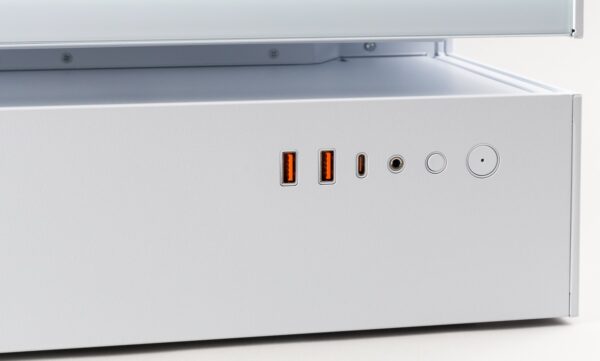 Durch die seitliche Anbringung dieser Knöpfe sowie der Anschlüsse kann das Gehäuse nur sinnvoll genutzt werden, wenn es auf der rechten Seite eines Schreibtisch betrieben wird.