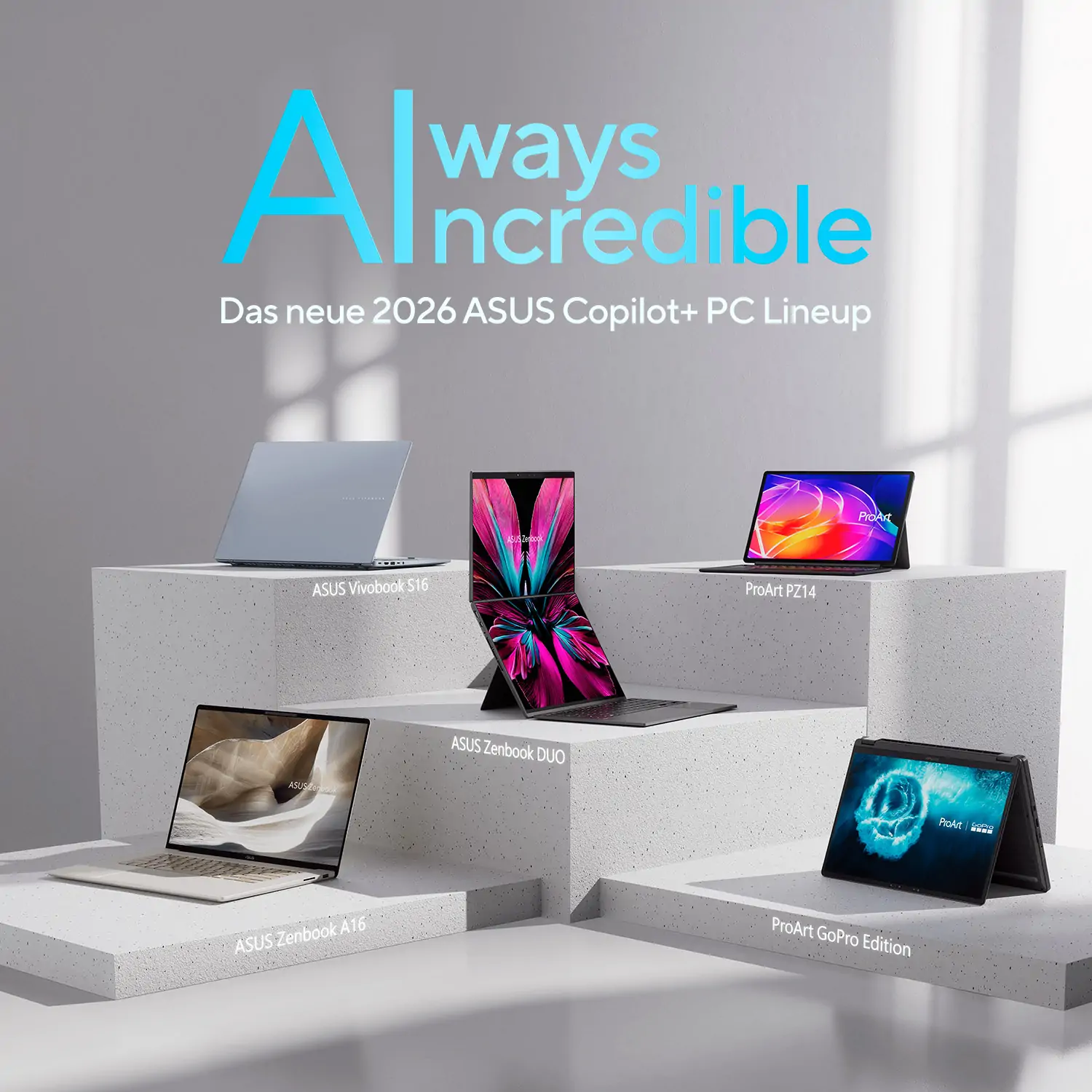 Weitere Informationen zu zusätzlichen Produkt-Highlights aus dem auf der CES 2026 vorgestellten Portfolio gibt es hier – darunter Details zur ASUS ProArt GoPro Edition, dem ASUS Zenbook DUO, dem ASUS Zenbook A16 und dem ASUS Zenbook A14.