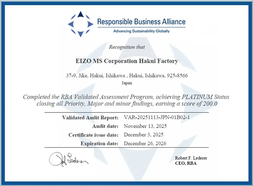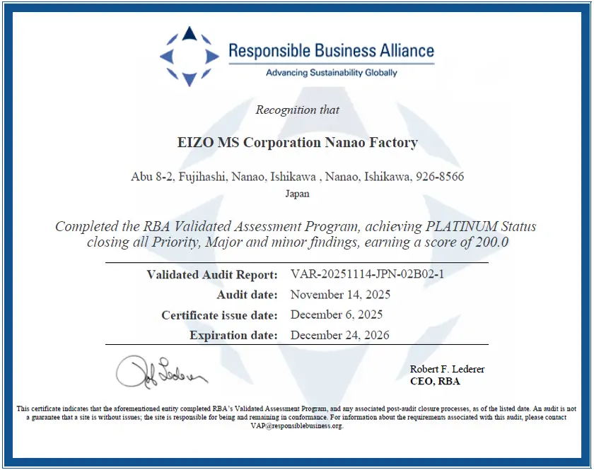 Die EIZO Corporation hat bekannt gegeben, dass ihre drei japanischen Produktionsstätten im Rahmen des „Validated Assessment Program“ (VAP) der „Responsible Business Alliance“ (RBA) mit dem höchsten Platin-Status ausgezeichnet wurden.
