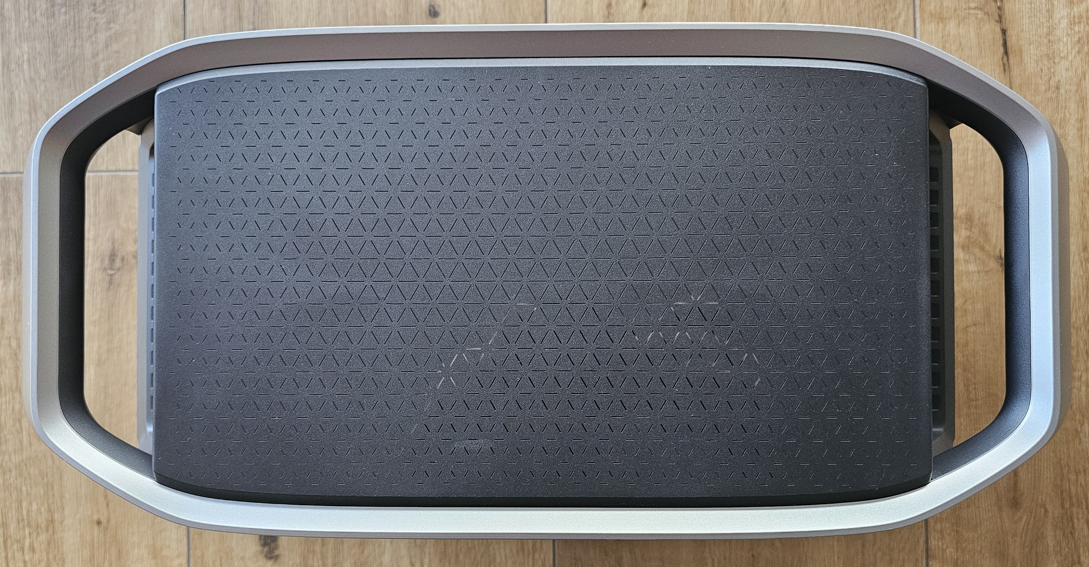 Die Oberseite der Powerstation ist mit einem Muster versehen, aber prinzipiell geschlossen. Die Stirnflächen sind jedoch offen und dienen der Kühlung der Powerstation. Daher hat sie auch keinen Schutz gegen Wasser oder Staub, was die Nutzung im Freien einschränkt. Auf der Unterseite sind zwei große gummierte Füße angebracht, richtige Fixierpunkte für eine Befestigung im Auto sind nicht sichtbar.