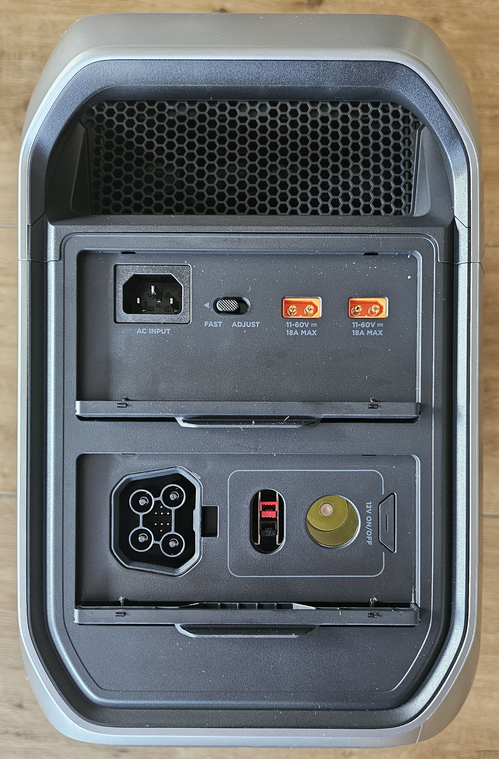 Auf der Rückseite befinden sich die Ladeanschlüsse – etwas geschützt durch eine Klappe. Die Anschlüsse sind gut beschriftet, gerade bei den beiden XT60 DC-Ladeanschlüssen finde ich die elektrischen Spezifikationen sehr sinnvoll. Für das AC-Laden gibt es eine Kaltgerätebuchse und daneben einen Schalter, mit dem ihr auswählen könnt, ob ihr die maximale oder eine über die App reduzierte Ladeleistung nutzen möchtet.