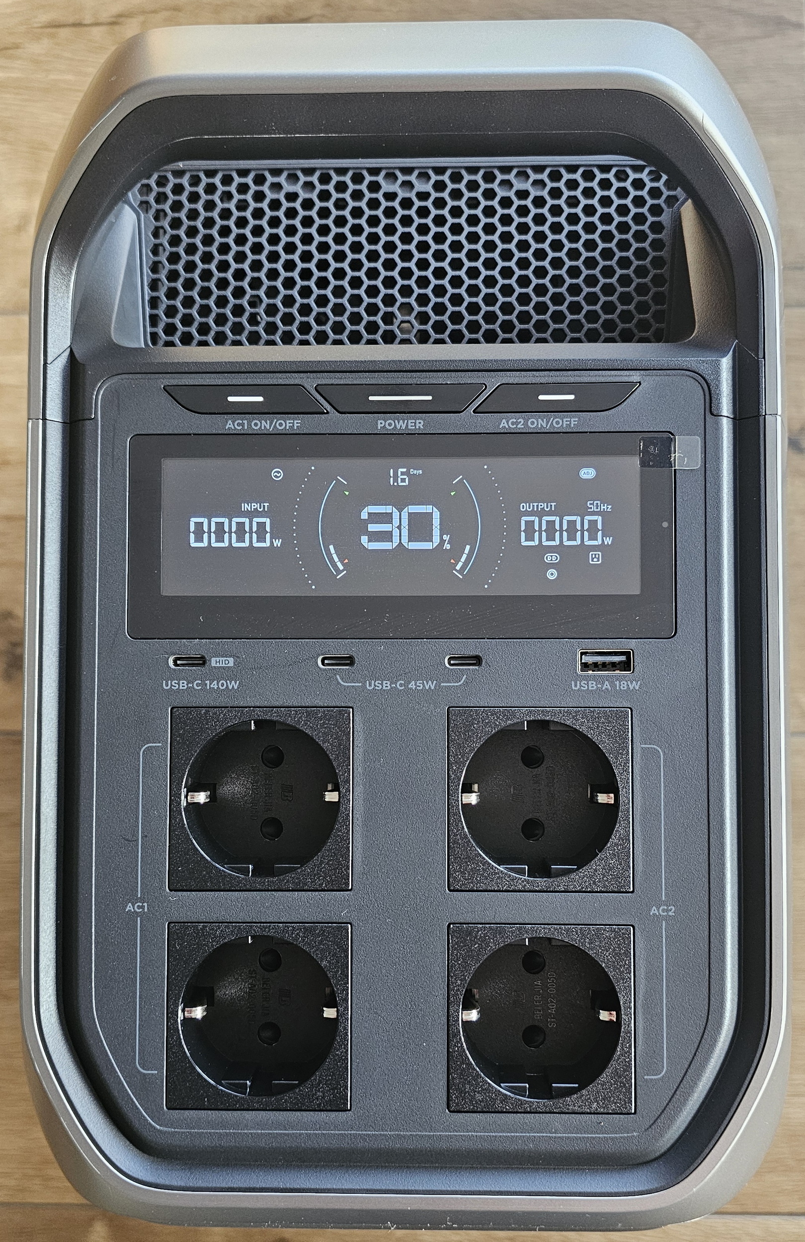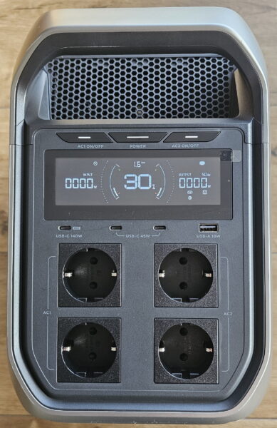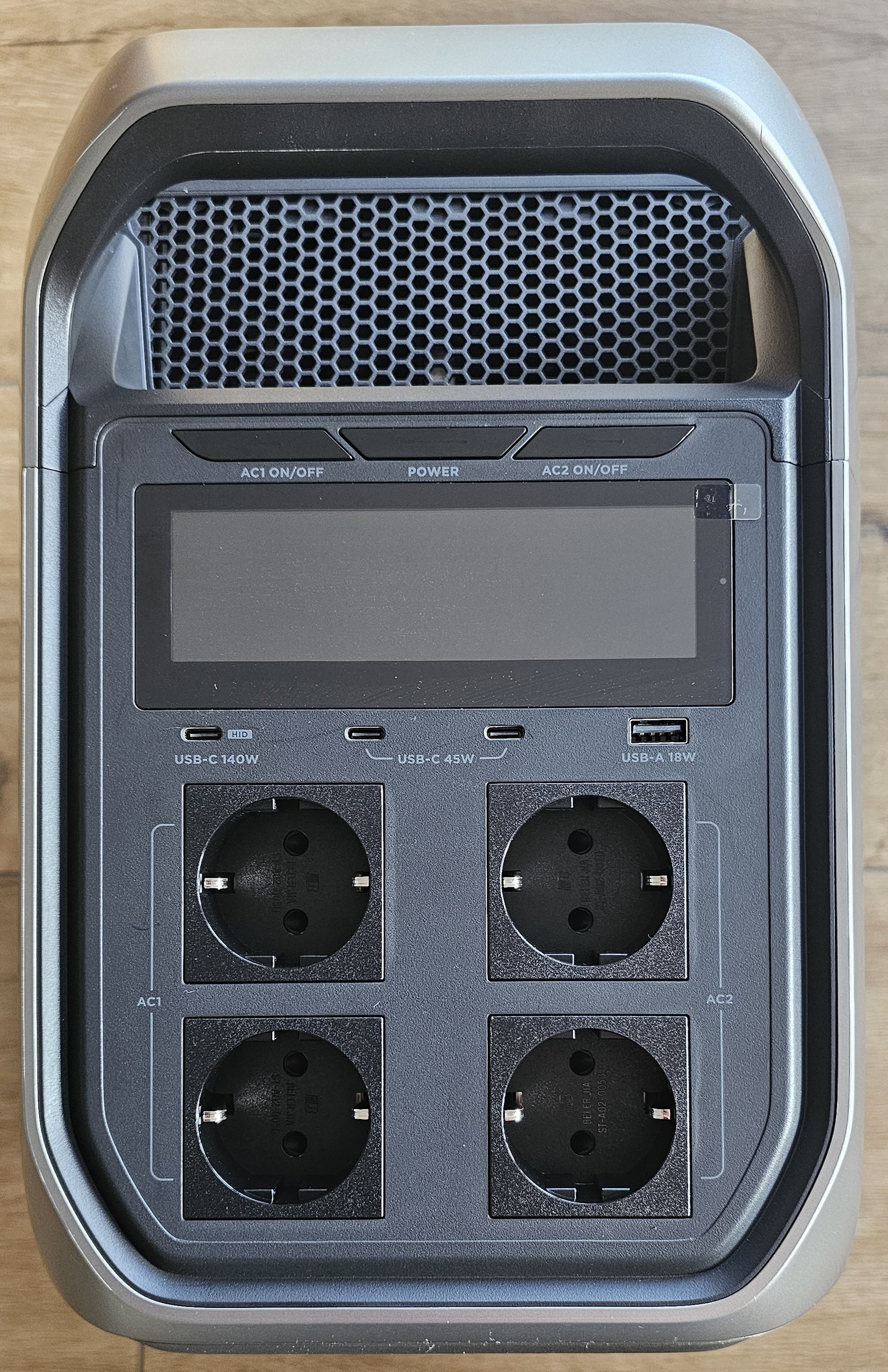Die Front verfügt über das große sehr gut ablesbare Display, drei Taster um die Powerstation und die linken bzw. rechten 230V-Steckdosen einzuschalten. Die drei USB-C-Ports (140 + 45 + 45W) und der USB-A Port (18W) sind immer aktiv, wenn die Powerstation eingeschaltet ist. Die Ports und Taster sind wieder einwandfrei beschriftet.