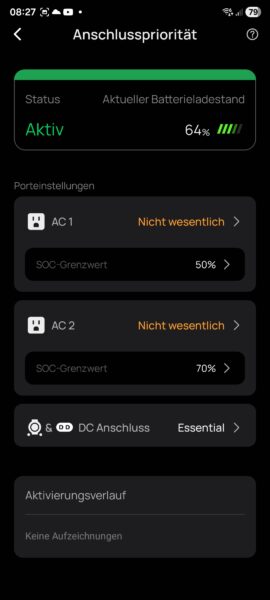 Die Ecoflow Delta 3 Max Plus weist ein paar Besonderheiten auf. Das fängt bei den Steckdosen an, welche in zwei Gruppen aufgeteilt sind. Über die App könnt ihr den SoC wählen und dass bei Unterschreitung dieses SoC die Steckdosen automatisch aktiviert oder deaktiviert werden sollen. Selbiges gilt für die Rückseitigen DC-Ausgänge.