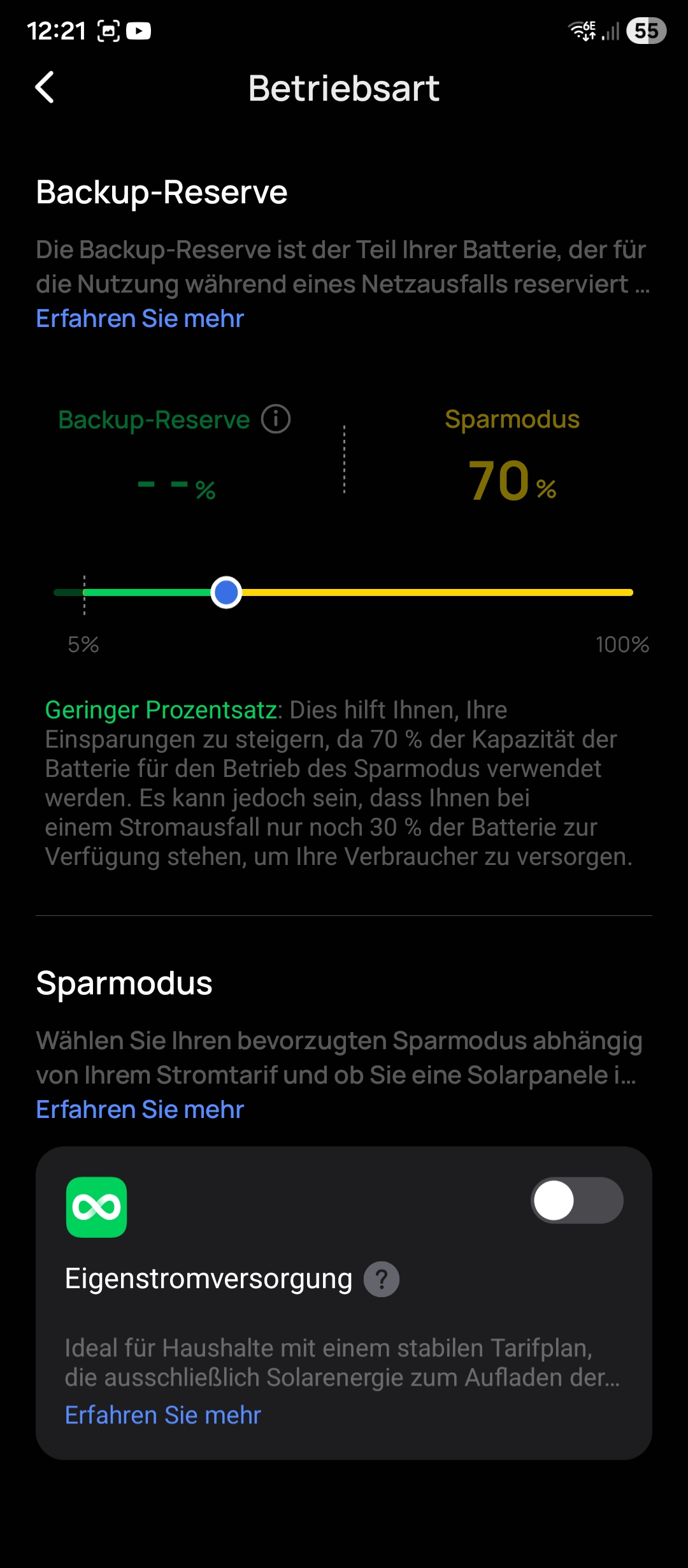 Falls ihr permanente Netzversorgung habt, aber die Powerstation mittels Solar als Insellösung zum Stromsparen nutzen wollt, könnt ihr den alternativen Betriebsmodus „Eigenstromversorgung“ nutzen. Die Verbraucher an der Powerstation werden über Solar bzw. den Akku versorgt, bis ein von euch definierter minimaler SoC erreicht wird. Wird dieser SoC unterschritten, wird automatisch das Stromnetz zur Versorgung der angeschlossenen Verbraucher genutzt. Fällt das Stromnetz in dem Moment aus, dient die verbleibende Energie im Akku als Backup, bis der Akku vollständig entladen ist. Letztlich gibt es auch noch die Möglichkeit, mittels geplanter Aufgaben eine Automatisierung zu erstellen.