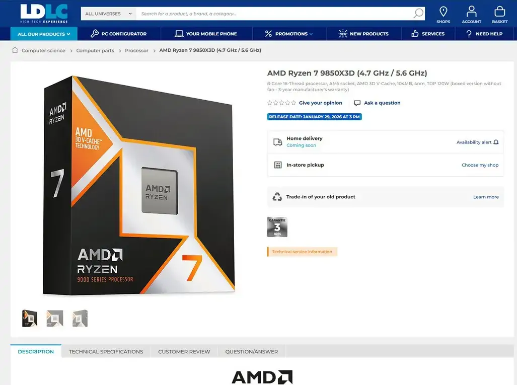Ein französischer Online-Shop hatte kurzzeitig den zur CES 2026 vorgestellten AMD Ryzen 7 9850X3D gelistet. Beim bekannten Retailer LDLC waren Produktseiten zu dem neuen Prozessor aufgetaucht, die auf einen Verkaufsstart am 29. Januar 2026 hindeuten. Besonders bemerkenswert: Es existierten gleich zwei Einträge – eine klassische Retail-Version („boxed“) sowie eine Tray-Variante, wie sie üblicherweise für Systemintegratoren vorgesehen ist.