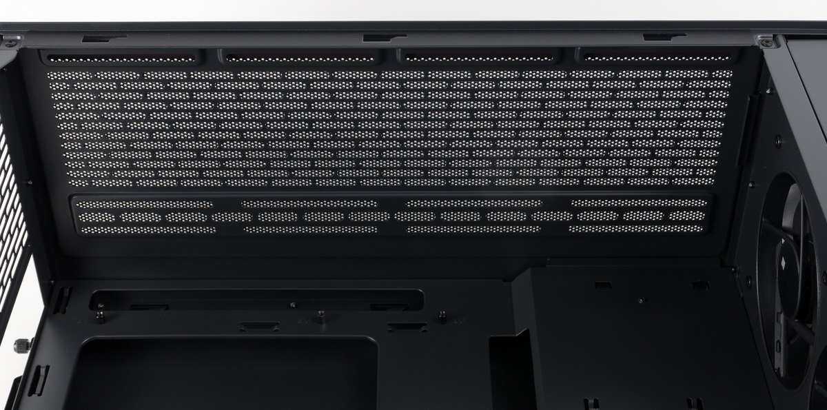 Auf dem Zwischenboden des Gehäuses gibt es zwar Lüftungsschlitze, diese sind aber für ein Netzteil vorgesehen, falls dieses mit dem Lüfter nach oben verbaut werden soll. Zusätzliche Lüfter können dagegen unter dem Top verbaut werden. Dort ist Platz für drei 120er oder alternativ zwei 140er Lüfter. Ein 360er Radiator könnte dort ebenfalls verbaut werden.