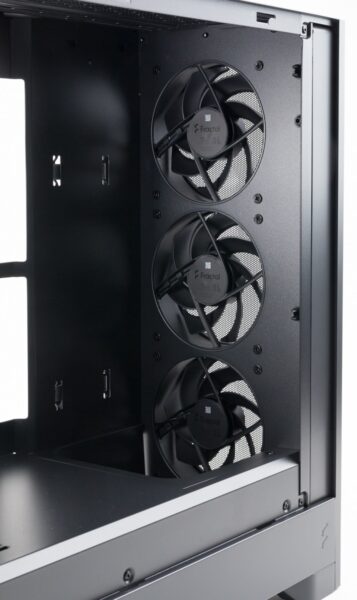Im hinteren Bereich kann ein weiterer 120-mm-Lüfter verbaut werden. Hinter der Front wurden bereits drei 120er Lüfter vorinstalliert. Diese sind bei uns unbeleuchtet, besitzen aber in der RGB-Version des Gehäuse eine Beleuchtung. Bei beiden Versionen handelt es sich leider nicht um PWM-Lüfter.