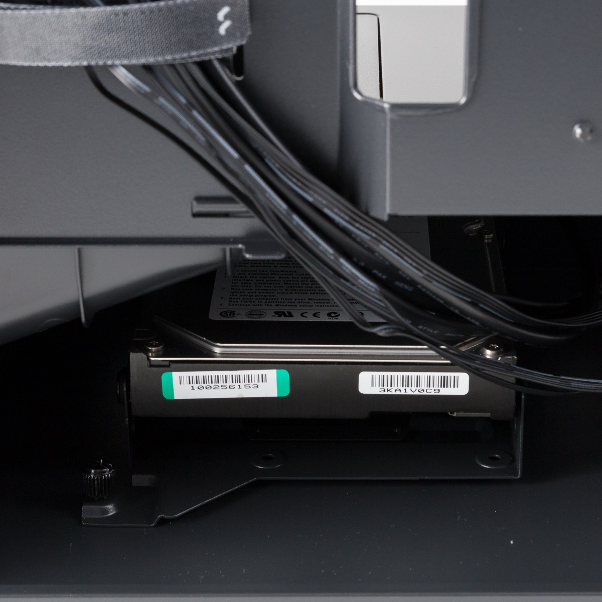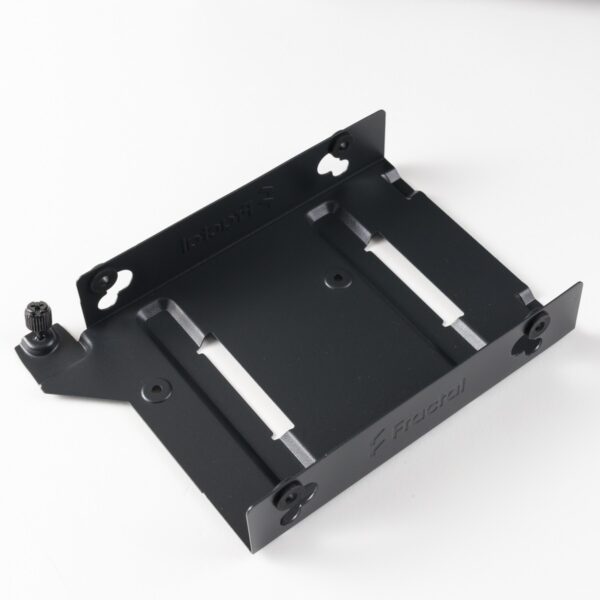 In der Halterung für die 3,5-Zoll-Festplatte kann eine zusätzliche SSD auf dem Boden verbaut werden. Diese wird dort verschraubt. Die große Festplatte wird ebenfalls verschraubt. Für diese stehen erfreulicherweise Gummierungen zur Verfügung, die eine leichte Entkopplung vom Gehäuse ermöglichen. Sollte ein überlanges Netzteil verbaut werden, lässt sich die Halterung über das Lösen einer Thumb-Screw auch vollständig entfernen.