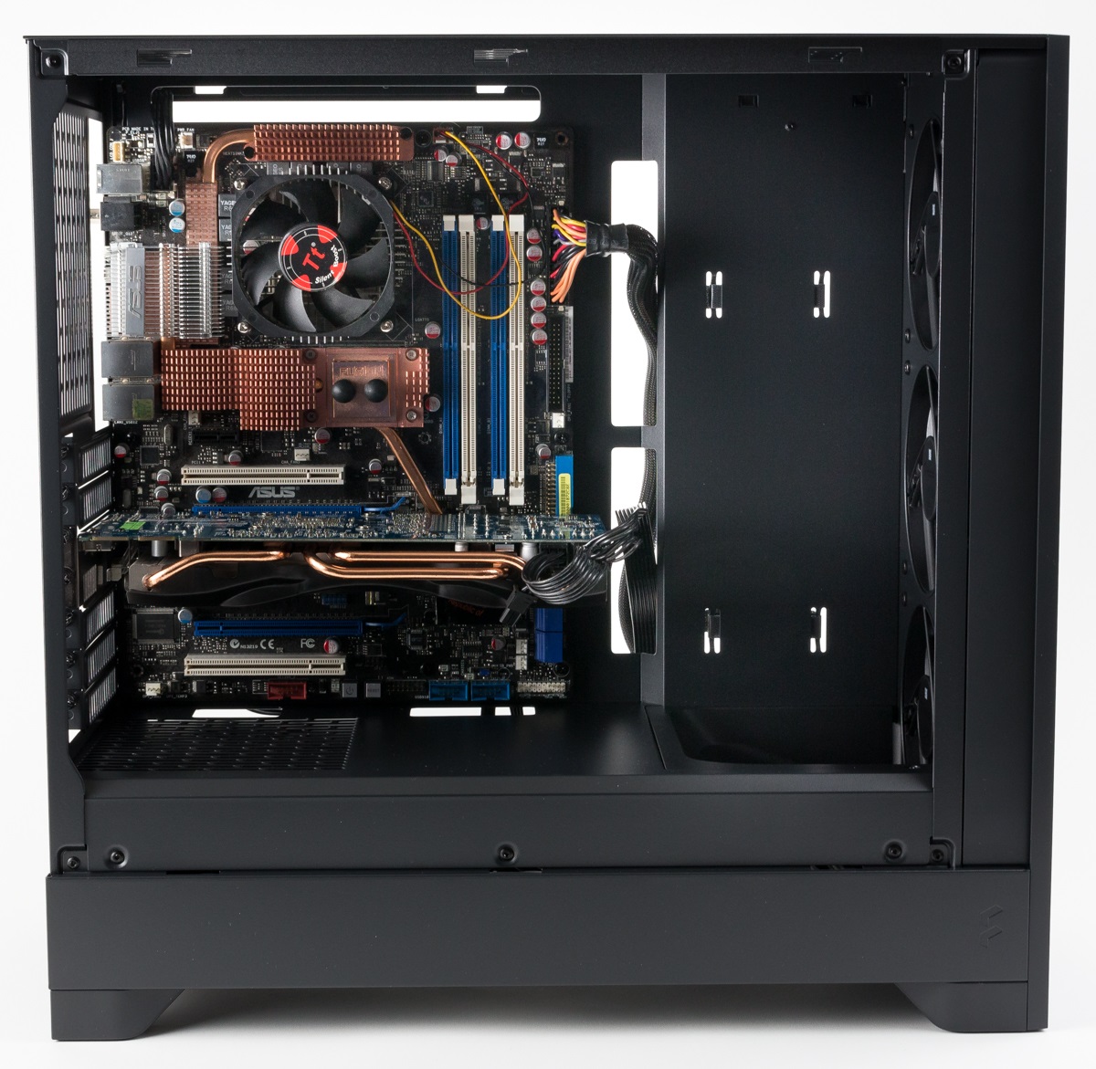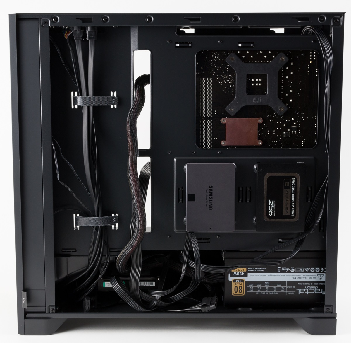 Im Gehäuse wurden einige wiederverwendbare Kabelbinder vorinstalliert, allerdings werden diese von den gehäuseeigenen Kabel schon gut ausgenutzt. Es steht in diesem Bereich allerdings ausreichend Platz zur Verfügung, um überflüssige Kabel zu verstecken und das rechte Seitenteil problemlos schließen zu können. Im eigentlichen Innenraum kann so ein cleaner Look erzeugt werden. Allerdings sind die Kabelführungen in den Innenraum nicht gummiert und erzeugen so insgesamt ein etwas unruhiges Gesamtbild.