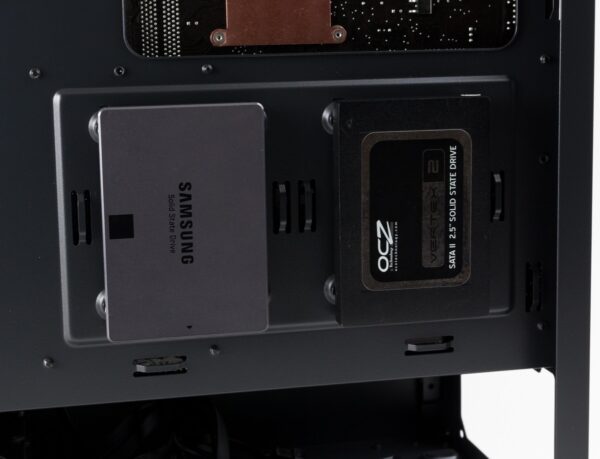 In dem Gehäuse können hinter dem Mainboard zwei SSDs befestigt werden. Dafür werden diese einfach auf die dort vorhandenen Pins gesteckt. Eine Verschraubung erfolgt nicht und trotzdem hielten diese in unserem Test problemlos an der gewünschten Stelle und ließen sich mit etwas Kraftaufwand auch wieder abziehen.