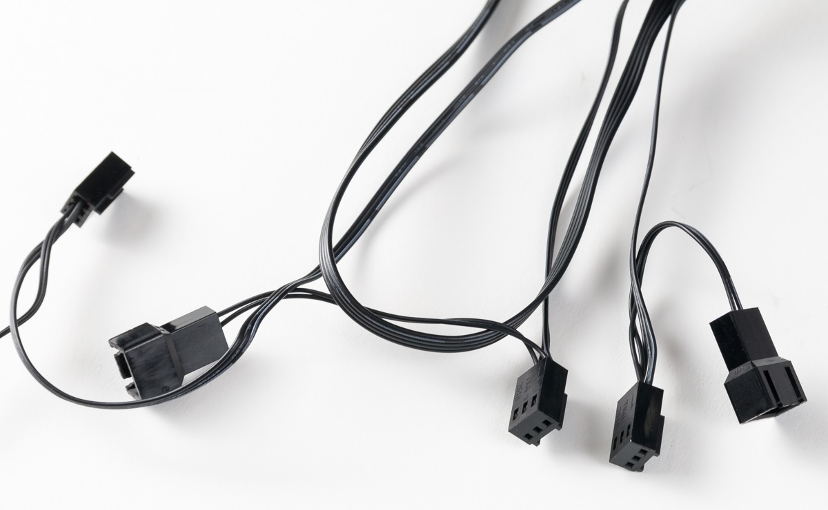 Die drei verbauten Lüfter besitzen jeweils einen 3-Pin-Anschluss sowie einen Adapter, um einen weiteren 3-Pin-Anschluss aufzunehmen, wodurch theoretisch alle drei Lüfter in Reihe geschaltet werden können. Es handelt sich bei den Lüftern leider nicht um PWM-Varianten, die einen 4-Pin-Anschluss besitzen.