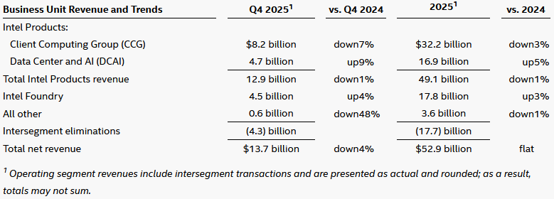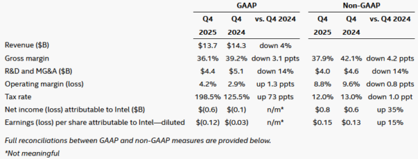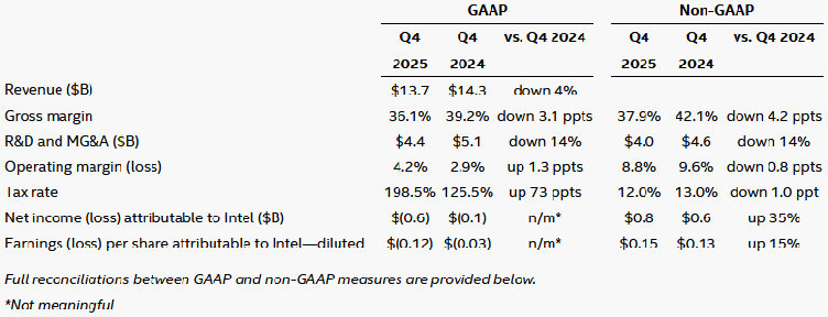 Intel Corporation today reported fourth-quarter and full-year 2025 financial results.