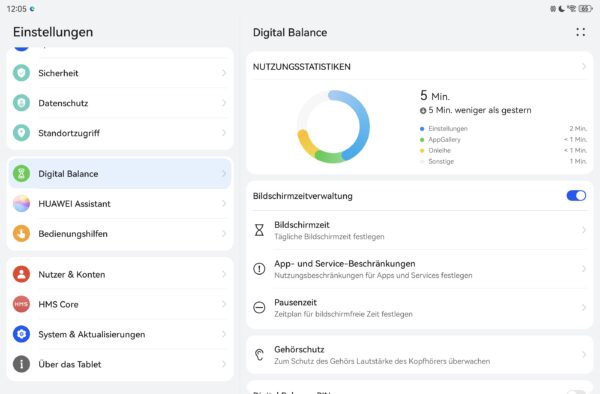 Durch die nicht native Unterstützung von Google ist auch der Kinderschutz von Google außen vor. Daher hat Huawei ein eigenes System umgesetzt. Für meinem Geschmack ist es nicht ausreichend ausgebaut. Es gibt die Funktion „Digital Balance“, welche aber nur funktioniert, wenn ihr einen eingeschränkten Benutzer für euer Kind anlegt. Das bedeutet konkret, dass das Kind auf eine eingeschränkte Auswahl eurer Apps Zugriff hat. In diesem Modus werden Konten nur eingeschränkt unterstützt, was bei mir in der Onleihe Probleme gemacht hat. Ein eigenes Konto unabhängig vom Erwachsenen-Account kann man gar nicht einrichten.
