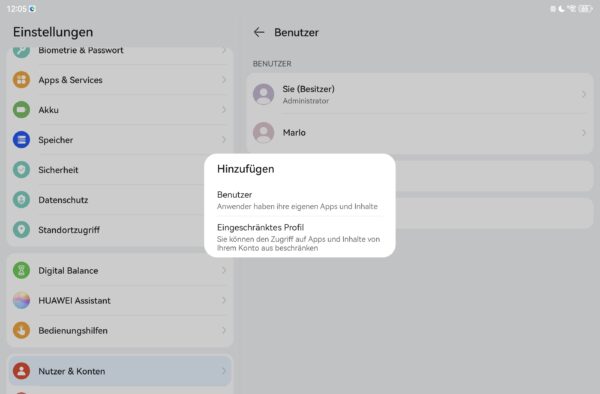 Alternativ kann man ein vollständiges Benutzerkonto mit eingeschränktem Kinderprofil anlegen, in dem dann separate Google-Konten, Apps usw. genutzt werden können. Huawei beschränkt den Zugriff auf Apps, aber diese können nicht individuell konfiguriert werden. Auch eine Einrichtung von Bildschirmzeiten etc. habe ich nicht gefunden. Wenn ihr auf einen umfangreichen Schutz bzw. Kontrolle der Kinder wert legt, müsst ihr hier selbst euren Weg finden.