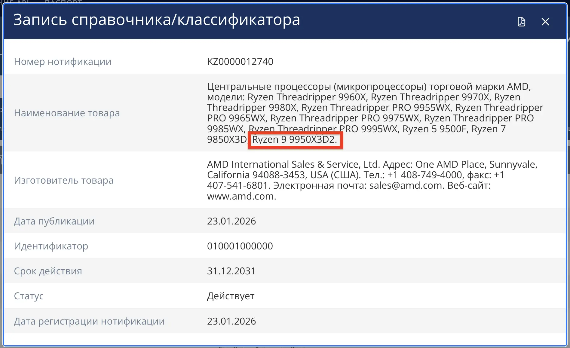 Auf der Website der eurasischen Wirtschaftskommission EEC (Eurasian Economic Commission), eine Behörde der Eurasischen Wirtschaftsunion, listet AMD neben bekannten CPU-Modellen auch den Ryzen 9 9950X3D2 nun selbst als für den Import nach Osteuropa registrierten Prozessor. Dies ist allerdings keine Garantie für eine sofortige Einführung dieser CPU. Manche Hersteller führen in ihren Listen auch Modelle nur als Platzhalter und bringen diese später gar nicht auf den Markt. Im Falle des Ryzen 9 9950X3D2 verdichten sich die Anzeichen aber, nachdem dieses CPU-Modell bereits im Herbst 2025 aufgetaucht war und es seitdem immer wieder entsprechende Berichte gab.