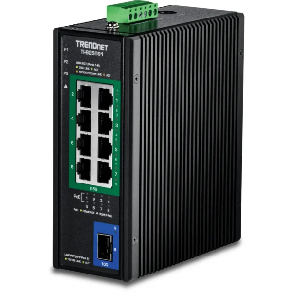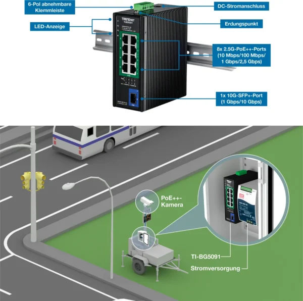 TRENDnet´s industrieller 2.5G-DIN-Rail-Switch TI-BG5091 mit 480W PoE-Budget kombiniert 10G-Konnektivität mit industrietauglicher Zuverlässigkeit und robuster PoE++-Technologie