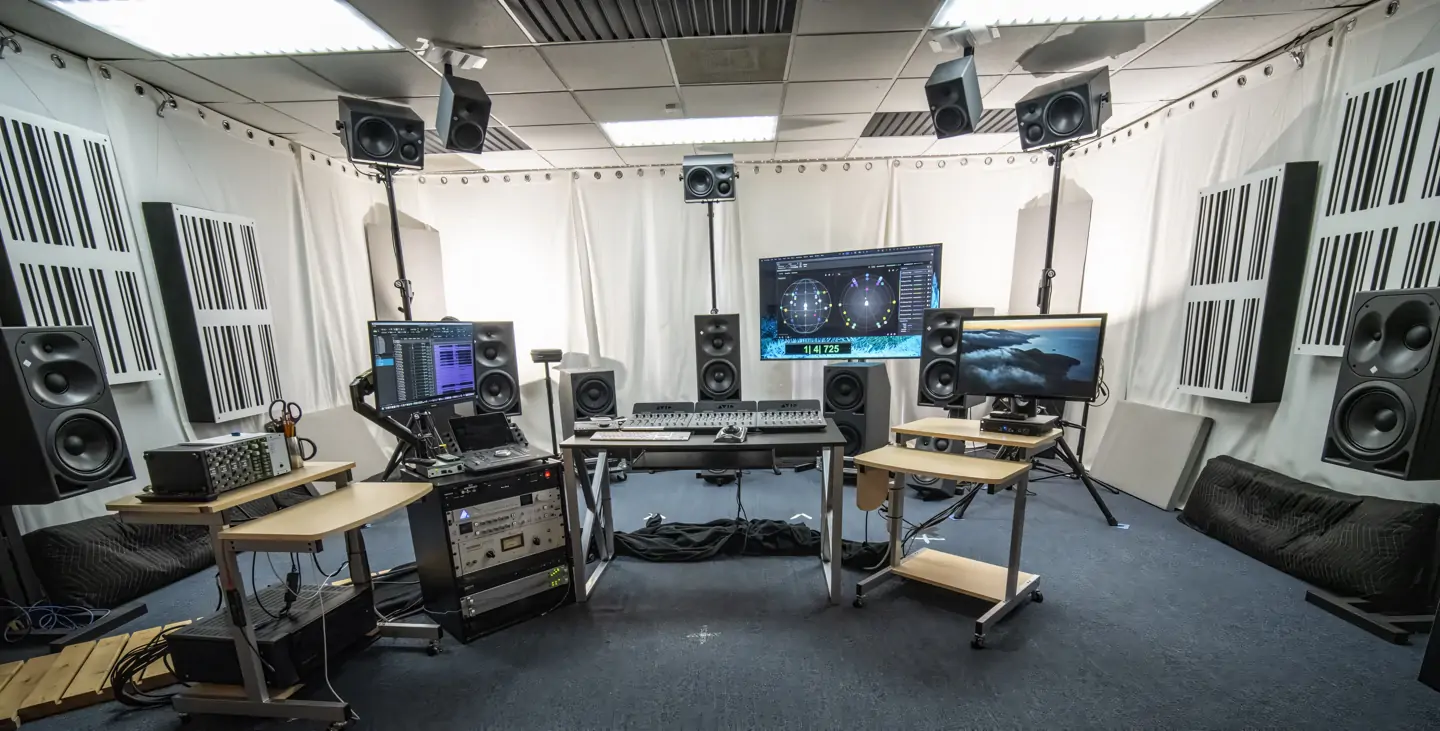 Das mediaHYPERIUM-Studio ist mit sieben Tri-Amp KH 420 Studiomonitoren und zwei KH 870 Subwoofern ausgestattet, ergänzt durch KH 310 und KH 120 in Höhen- und Bodenpositionen – ein hybrides Layout, das nahtlos zwischen verschiedenen immersiven Formaten wechseln kann.