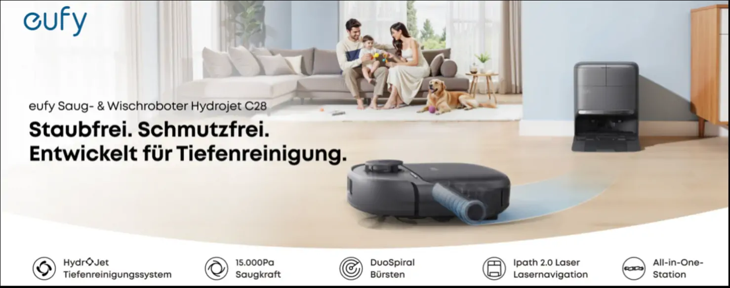 Passend zum nahenden Frühjahrsputz bringt ANKER mit dem neuen eufy C28 Saugroboter mit Wischstation ein neues Mittelklasse-Modell auf den Markt. Ab sofort ist er für 599 Euro auf der eufy Webseite, bei Amazon und im Handel erhältlich (Aktuell im Angebot für 499 Euro bis zum 15. Februar). Das Herzstück des Systems ist die vom Premium-Modell eufy S1 Pro bekannte HydroJet™-Technologie mit selbstreinigender Wischrolle. Während der Fahrt reinigt sich die Wischrolle kontinuierlich selbst mit Frischwasser. Das erstmals von eufy in der Mittelklasse eingesetzte Feature sorgt für streifenfreie Böden und eine konstant saubere Wischfläche, auch bei größeren Wohnungen oder Häusern. Ärgerlich für Tierhaare und hartnäckigen Staub: 15.000 Pascal an leistungsstarker Turbo-Saugkraft lassen Schmutz nicht den Hauch einer Chance.