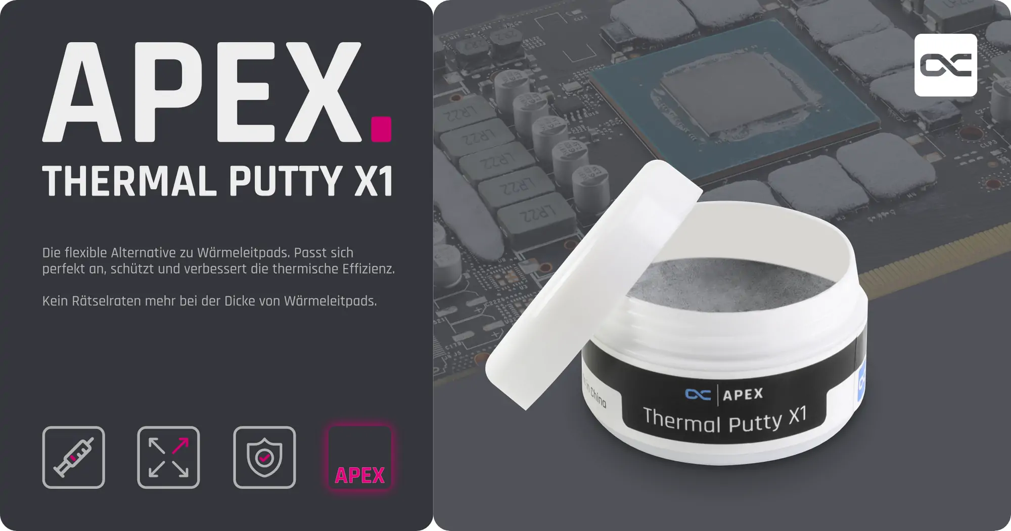 Die Alphacool International GmbH aus Braunschweig ist Vorreiter in der PC-Wasserkühlungstechnologie. Mit einem der umfassendsten Produktportfolios der Branche und über 20 Jahren Erfahrung, erweitert Alphacool nun mit dem Apex Thermal Putty X1.