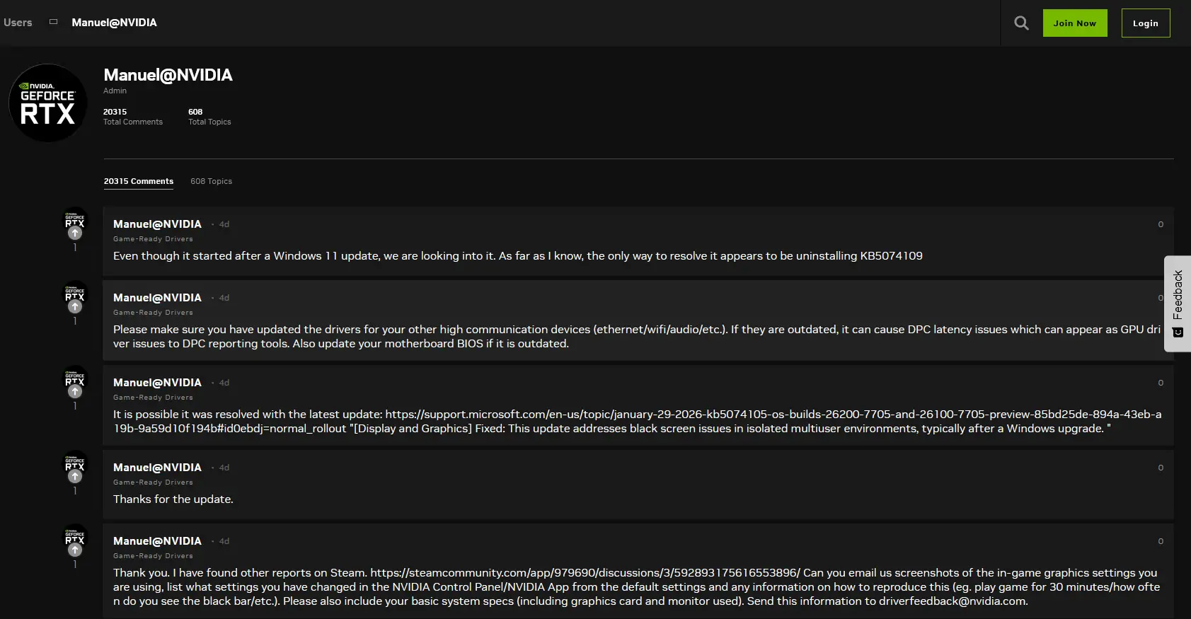 In den Nvidia-Foren häufen sich entsprechende Beschwerden. Viele Anwender vermuteten zunächst einen Zusammenhang mit den ebenfalls im Januar veröffentlichten Nvidia-Treibern. Mittlerweile gilt jedoch das Windows-Update KB5074109 als Hauptverursacher. Mehrere Nutzer berichten übereinstimmend, dass nach der Deinstallation des Updates sämtliche Probleme verschwunden seien. Ähnliche Rückmeldungen finden sich auch im Microsoft Feedback Hub, wo von Abstürzen, Einfrieren des Systems und instabiler GPU-Nutzung die Rede ist.