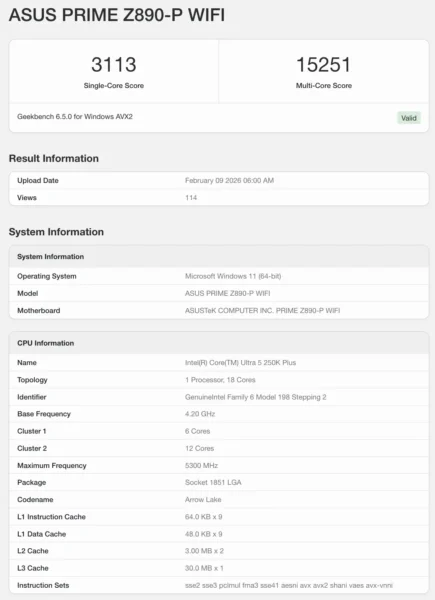 Getestet wurde der Prozessor auf einem ASUS PRIME Z890-P WIFI-Mainboard, kombiniert mit 32 GByte Arbeitsspeicher. Im Geekbench erzielte der Core Ultra 5 250K Plus 3113 Punkte im Single-Core-Test und 15.251 Punkte im Multi-Core-Test. Wie üblich gilt bei frühen Datenbankeinträgen: Finale BIOS-Versionen und Retail-Silizium könnten die Leistung noch leicht verändern. Das müsste es auch, denn der Core Ultra 5 245K zeigt im Geekbench als Vorgängermodell teilweise höhere Ergebnisse.