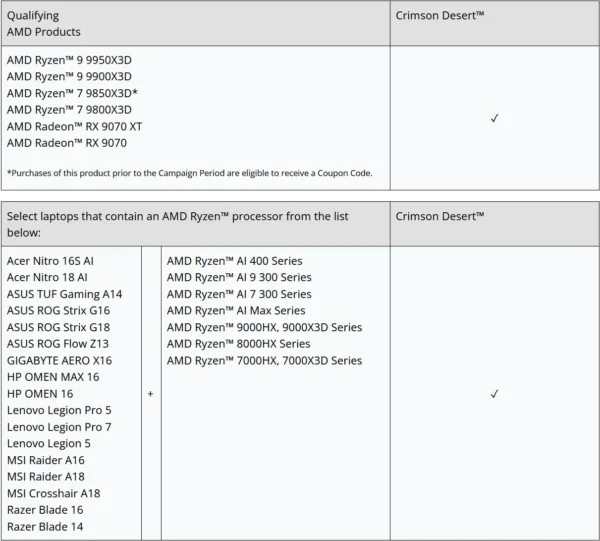 AMD startet eine neue AMD-Rewards-Aktion in Kooperation mit dem Spieleentwickler Pearl Abyss und dessen kommendem Action-RPG „Crimson Desert“. Käufer ausgewählter Ryzen-Prozessoren, Radeon-Grafikkarten sowie qualifizierter OEM- und Notebook-Systeme erhalten einen Game-Code für diesen Titel. Die Aktion läuft vom 10. Februar 2026 bis zum 25. April 2026, der Einlösezeitraum endet am 23. Mai 2026.
