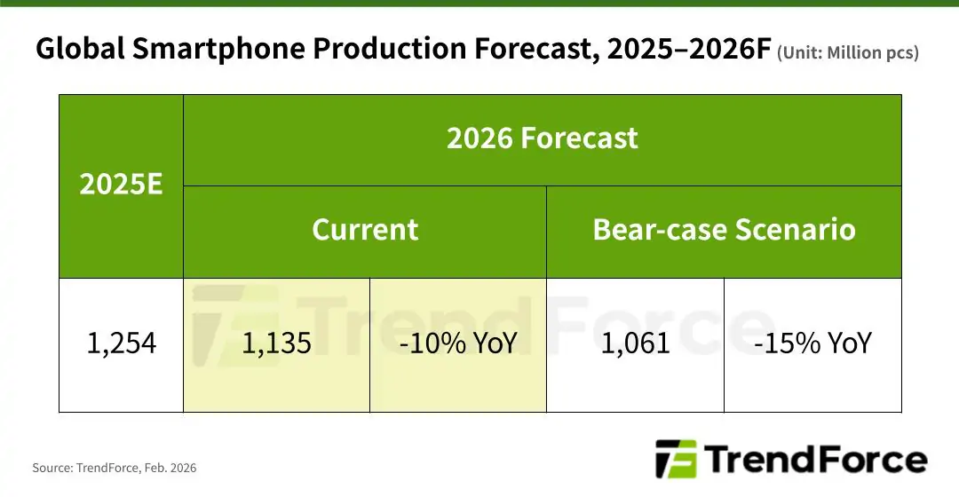 TrendForce’s latest smartphone industry research predicts that soaring memory prices are set to weigh heavily on global smartphone production in 2026. Total output is forecast to decline 10% YoY to approximately 1.135 billion units. With memory prices showing no clear signs of easing, the growing gap between higher retail prices and consumer price tolerance is expected to further dampen end demand.