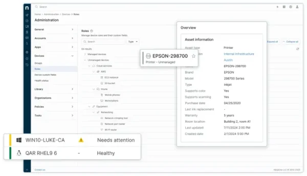 - Höhere Sicherheit durch vollständige Asset-Transparenz – Mithilfe von NinjaOne können IT-Teams unverwaltete und veraltete Geräte identifizieren, deren Verbindung zur Umgebung nachvollziehen und gezielte Maßnahmen zur Reduzierung versteckter Risiken ergreifen.