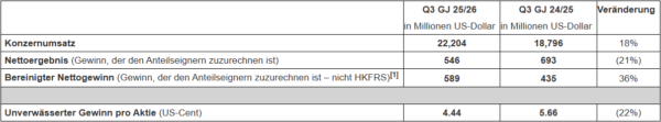 Lenovo Group Limited (HKSE: 992) (ADR: LNVGY) hat heute zusammen mit ihren Tochtergesellschaften („die Gruppe“) die Ergebnisse für das dritte Quartal des Geschäftsjahres 2025/26 bekannt gegeben, in dem Rekordumsätze, eine beschleunigte Rentabilität und ein anhaltendes KI-Umsatzwachstum erzielt wurden. Im Laufe des Quartals erreichte der Gesamtumsatz der Gruppe mit 22,2 Milliarden US-Dollar einen neuen Höchststand für ein Geschäftsquartal, was einem Anstieg von 18 % gegenüber dem Vorjahr entspricht, wobei alle Geschäftsbereiche ein zweistelliges Umsatzwachstum gegenüber dem Vorjahr verzeichneten. Ohne Berücksichtigung von nicht operativen, nicht zahlungswirksamen Posten und einmaligen Gewinnen und Aufwendungen im dritten Quartal des Geschäftsjahres 24/25 und im dritten Quartal des Geschäftsjahres 25/26 stieg der bereinigte Nettogewinn (Gewinn, der den Anteilseignern zuzurechnen ist – nicht HKFRS)[1] im Vergleich zum Vorjahreszeitraum um 36 % auf 589 Millionen US-Dollar, wobei die bereinigte Nettogewinnmarge[1] auf 2,7 % stieg.