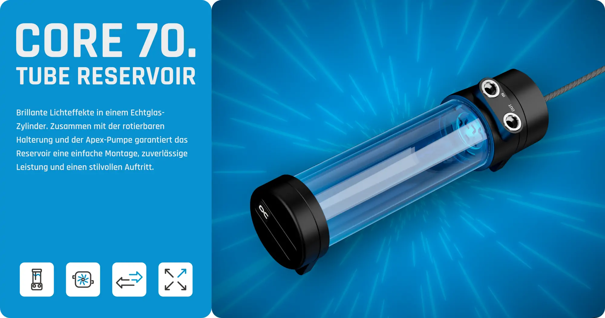 Das Core 70 Tube Reservoir ist ab sofort im Alphacool Shop erhältlich.
