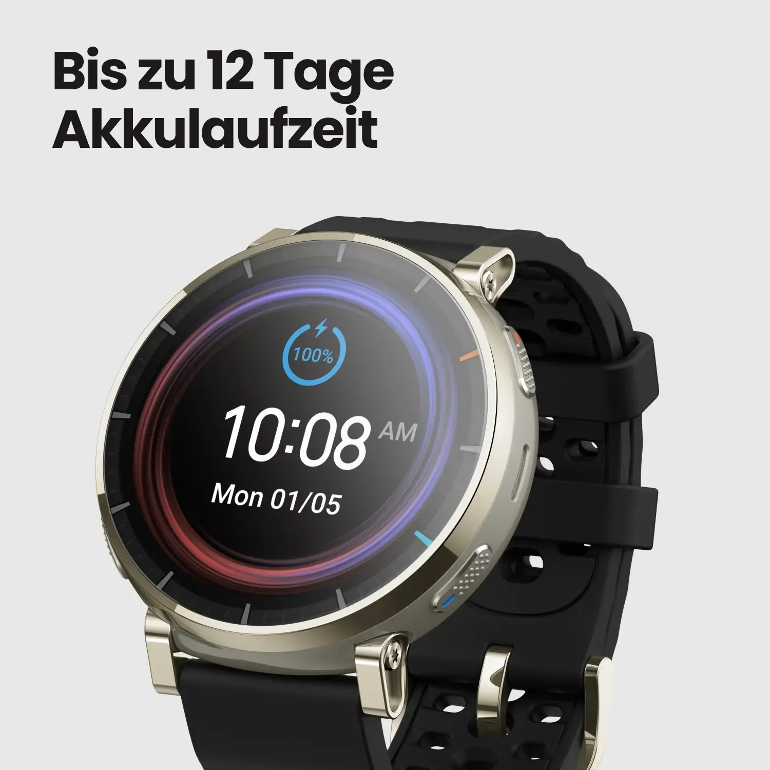 Die Uhr verfügt über ein 45-mm-Edelstahlgehäuse und vier griffige Bedientasten und ist ebenso robust wie elegant und komfortabel. Das 1,32-Zoll-AMOLED-Display ist durch kratzfestes Saphirglas geschützt und verfügt über eine Spitzenhelligkeit von 3.000 Nits, damit die Trainingsdaten auch bei direkter Sonneneinstrahlung kristallklar zu erkennen sind.