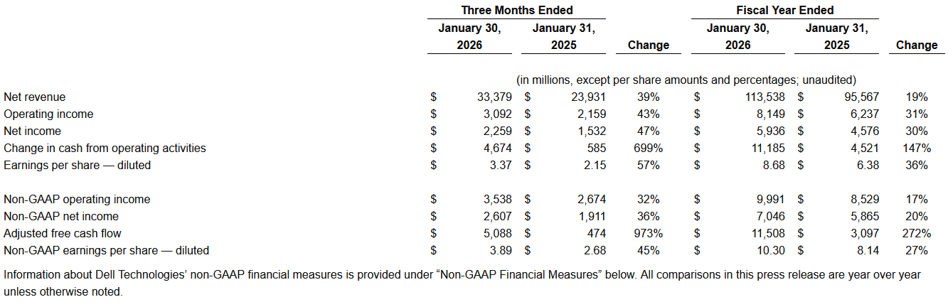 Dell Technologies (NYSE: DELL) announces financial results for its fiscal 2026 fourth quarter and full year ended January 30, 2026. The company also provides guidance for its fiscal 2027 first quarter and full year.