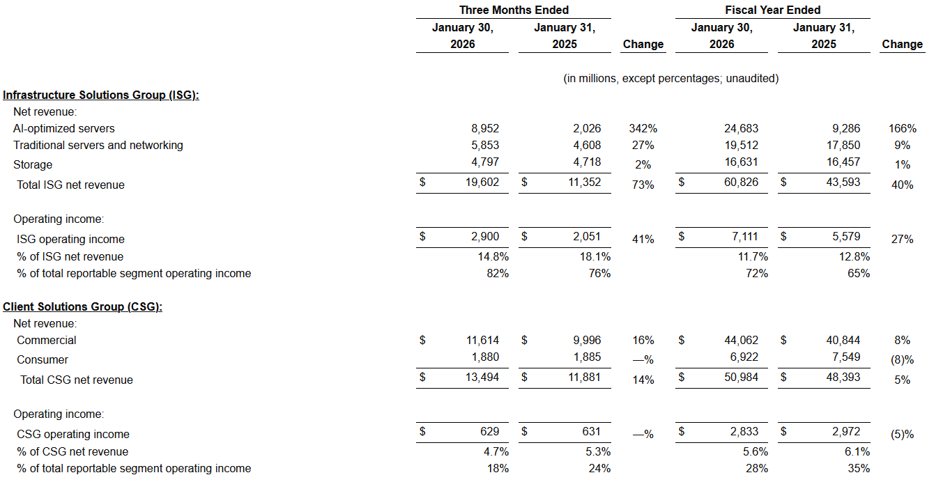 - Record quarterly Traditional Servers and Networking revenue: $5.9 billion, up 27% year over year
