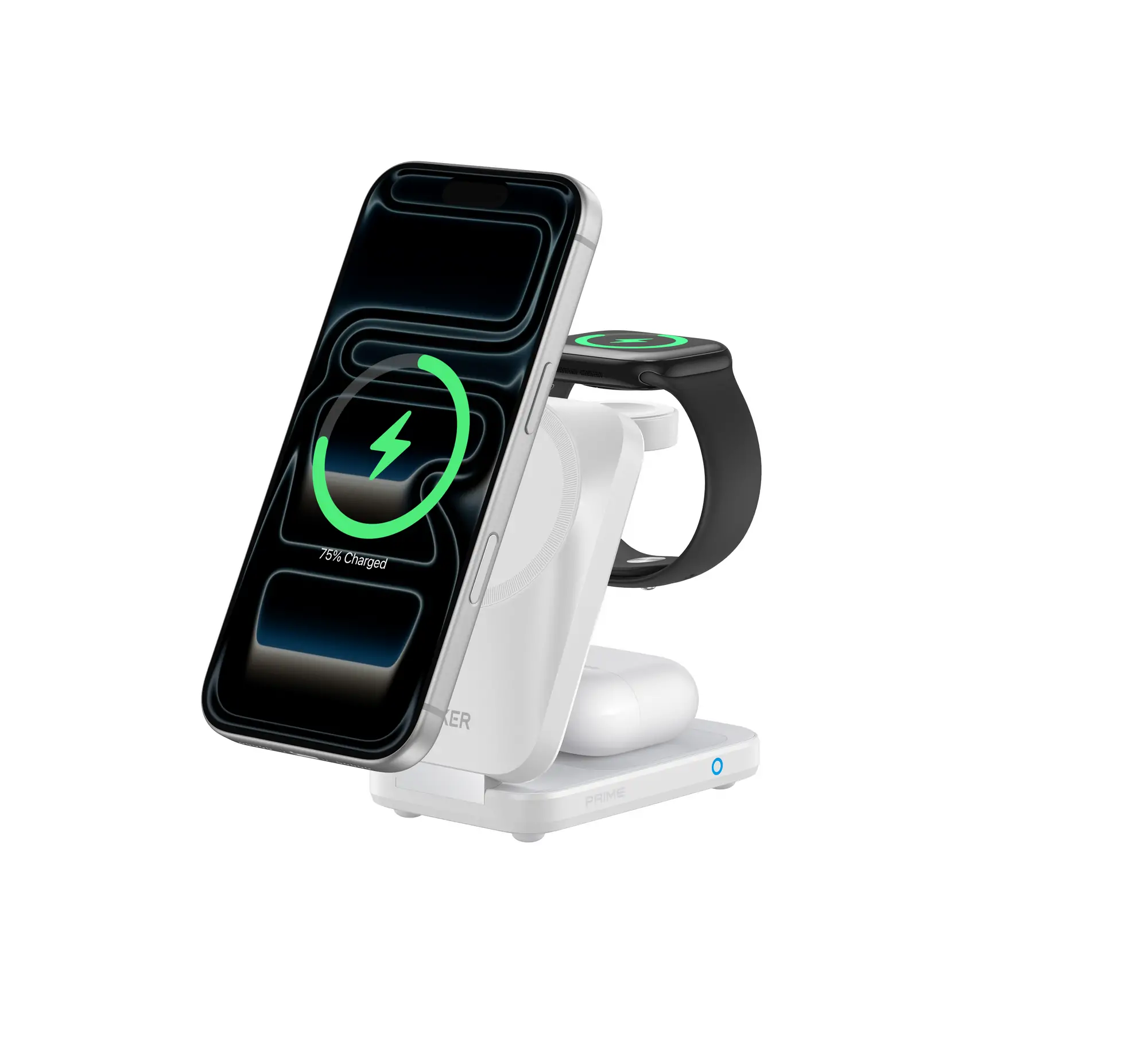 Zusätzlich enthüllt ANKER die Anker Prime Wireless Charging Station. Die clevere 3-in-1 Lösung bietet mit dem drahtlosen MagGo, der AirCool-Technologie und faltbarem Design ultraschnelles Laden nach dem Qi 2.2-Standard mit 25 Watt für das Smartphone. Nicht nur das: Die handflächengroße, faltbare Ladestation lädt neben den iPhones, Pixels und anderen Handys auch die Apple Watch und drahtlose Kopfhörer wie die soundcore Liberty 5 gleichzeitig.