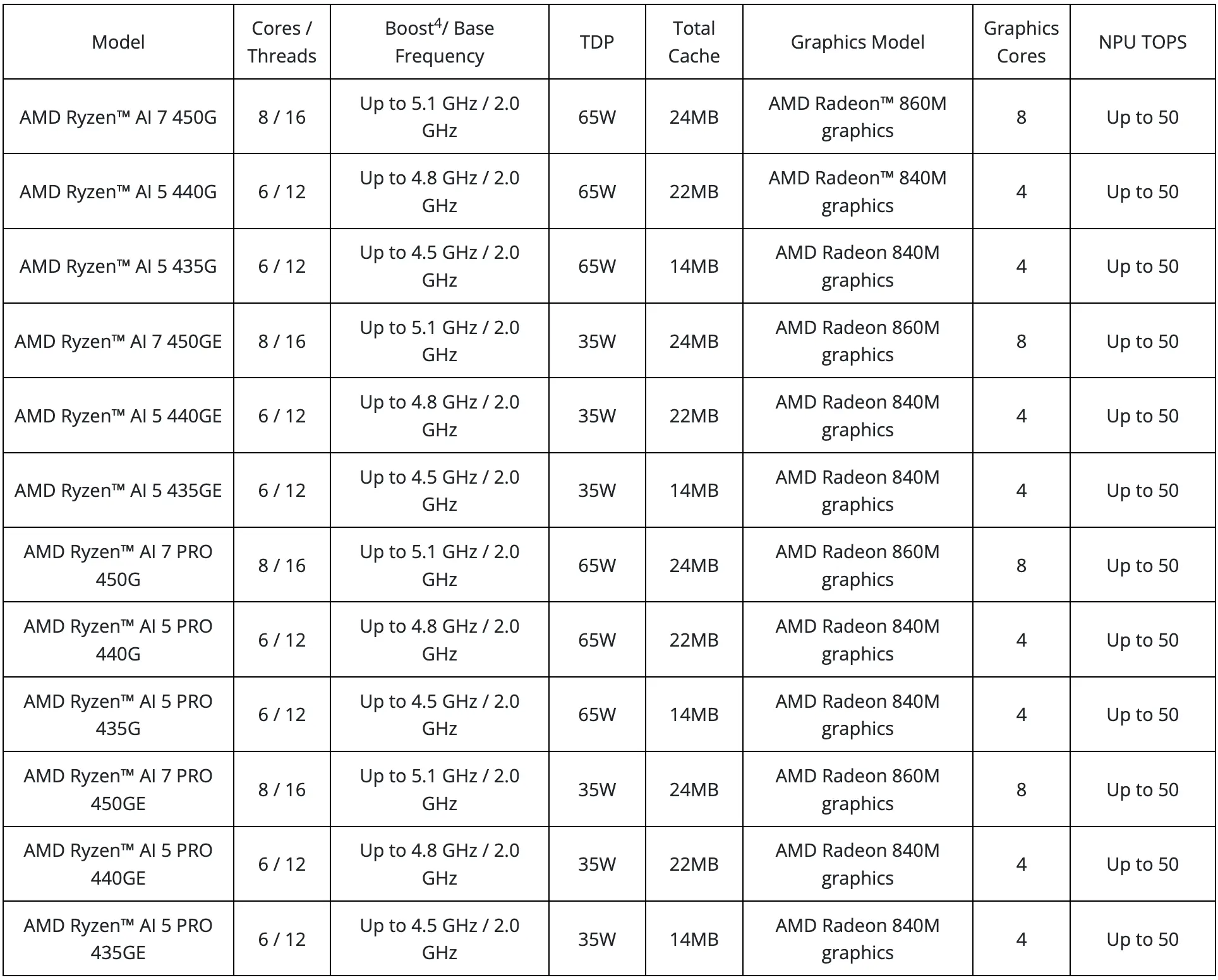 Auch die Produktsegmentierung spricht eine klare Sprache. Das Topmodell Ryzen AI 7 450G bietet 8 Kerne und 16 Threads in einer 4+4-Konfiguration aus Zen 5 und Zen 5c – obwohl das zugrunde liegende Silizium höhere Kernzahlen zulassen könnte. Bei der integrierten Grafik zeigt sich ebenfalls Zurückhaltung: Der 450G aktiviert 8 Compute Units, kleinere Modelle reduzieren auf 4 CUs. Eine APU für ambitioniertes 1080p-Gaming ohne dedizierte Grafikkarte ist das damit eher nicht.