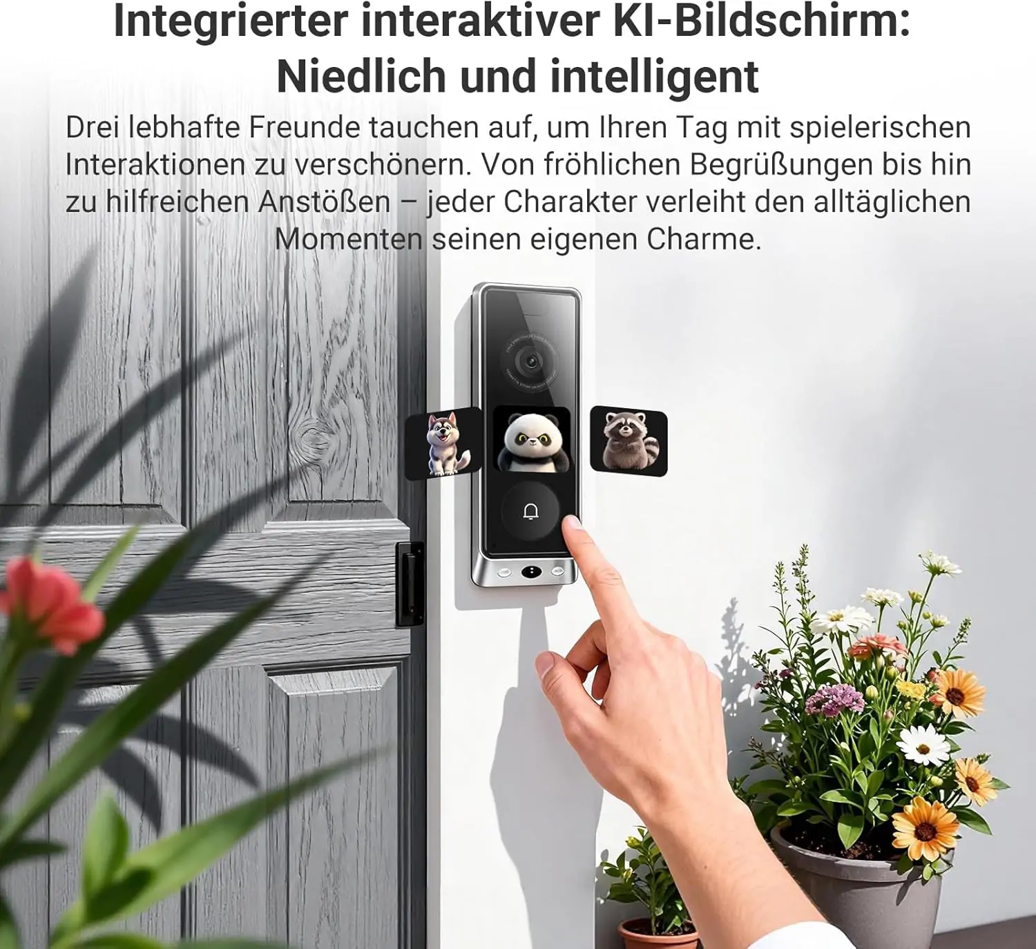Die EP8 Ultra verfügt über eine KI-gestützte Erkennung, die nicht nur Bewegungen registriert, sondern auch erkennt, wer gerade vor der Tür steht. Das System identifiziert mit der Zeit bekannte Gesichter wie Familienmitglieder oder Freund:innen und kann sie von Fremden unterscheiden. Besucher:innen können zudem mit drei animierten Zeichentrickfiguren visuell angesprochen und begrüßt werden. Diese freundliche „Türpräsenz“ gestaltet die Interaktionen persönlicher und einladender.