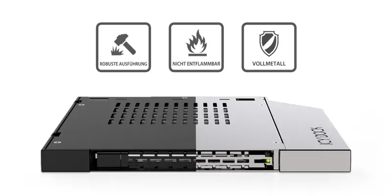 Mit der renommierten ToughArmor-Vollmetallkonstruktion von ICY DOCK sorgt der MB411V4PO-2B für maximale Haltbarkeit und Schutz sowohl für das Laufwerk als auch das Gerät selbst. Das robuste Metallgehäuse und -tray erfüllen die UL94 V0-Entflammbarkeitsanforderungen und bieten erhöhte Sicherheit und Zuverlässigkeit für Serverräume, militärische und industrielle Anwendungen, bei denen Stabilität und Ausdauer unerlässlich sind.